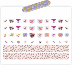 - Rinkinio turinys: 30 nagų lipdukų, 10 mažesnių lipdukų, 1 iškirpimui skirtas raštų juostelės lapelis, 1 nagų dildė.
