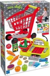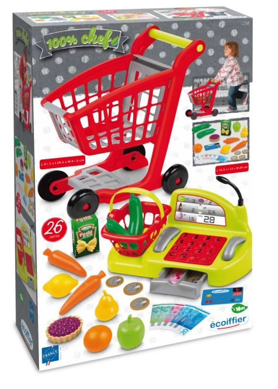 Vaikiškas žaidimų rinkinys žaidimui „parduotuvė“ siūlo viską, ko reikia mažiesiems pardavėjams: pirkinių vežimėlį, kasą su pinigais, mokėjimo kortele, skaitytuvu ir mikrofonu, taip pat vaisių ir daržovių priedus bei mažą rankinį pirkinių krepšelį. Puikiai tinka vaizduotei, socialiniams įgūdžiams ir motorikai lavinti.