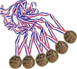 Leiskite kiekvienam mažajam nugalėtojui pasidžiaugti pergale. Auksiniai medaliai su užrašu WINNER ir žvaigždutėmis atrodo reprezentatyviai, o dėl PVC medžiagos yra saugūs ir lengvi. Dėl trispalvės juostelės juos malonu dėvėti ir patogu dalinti varžybų ar renginių metu.