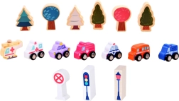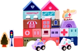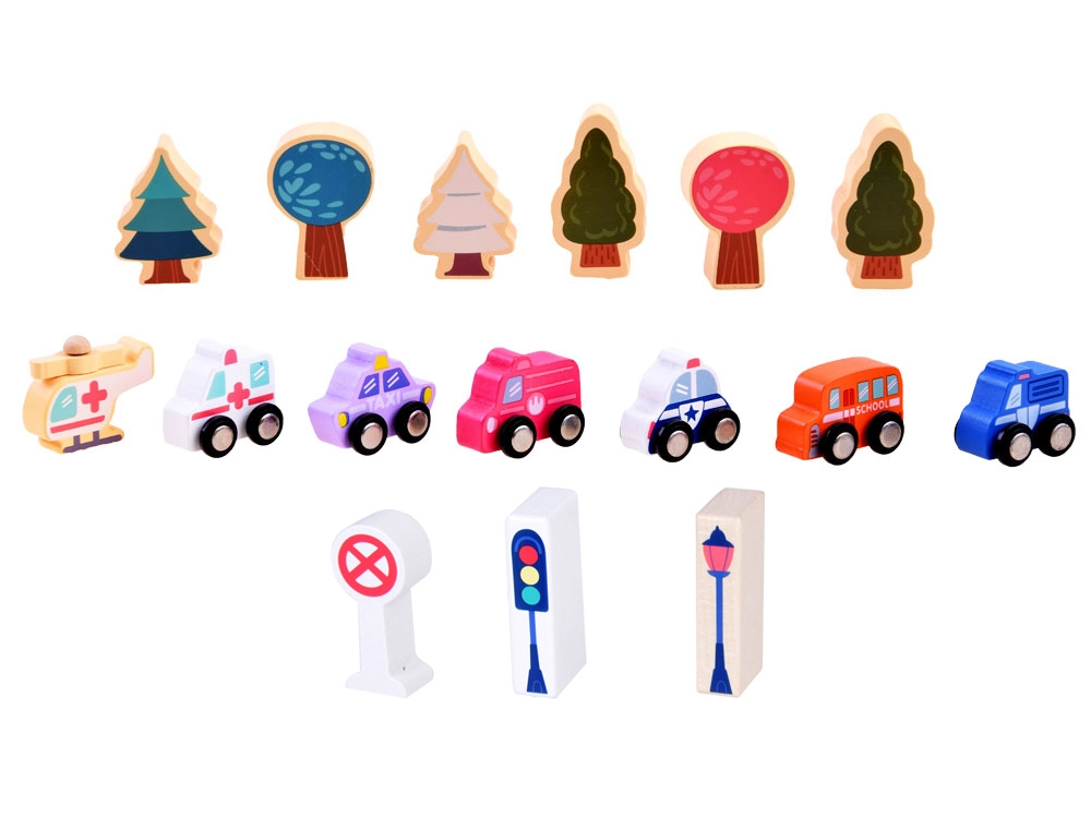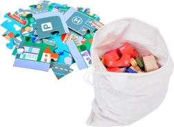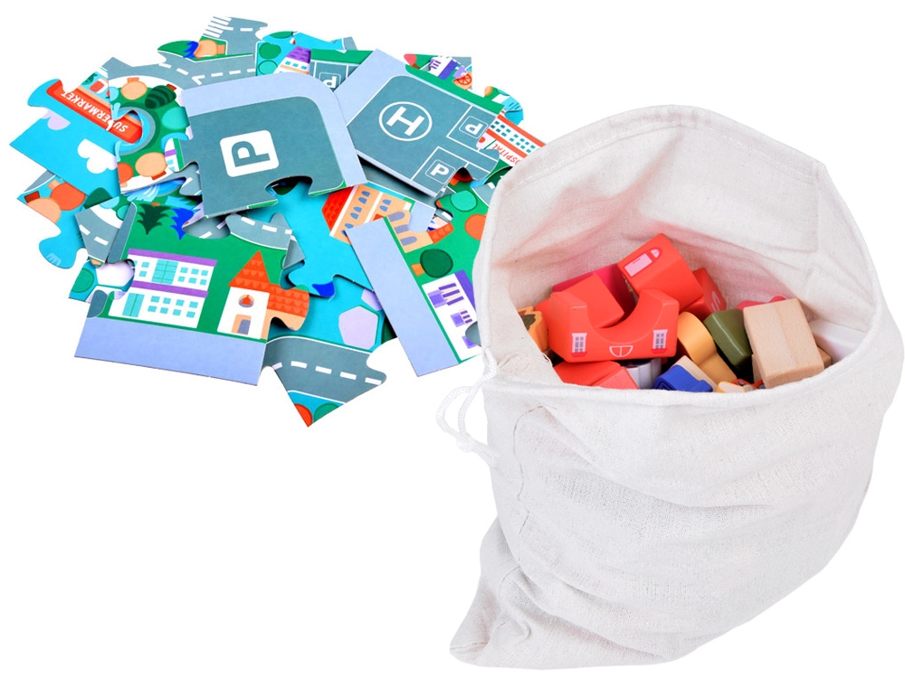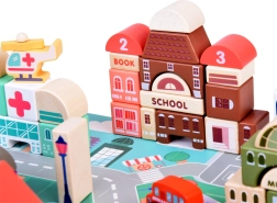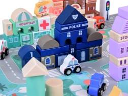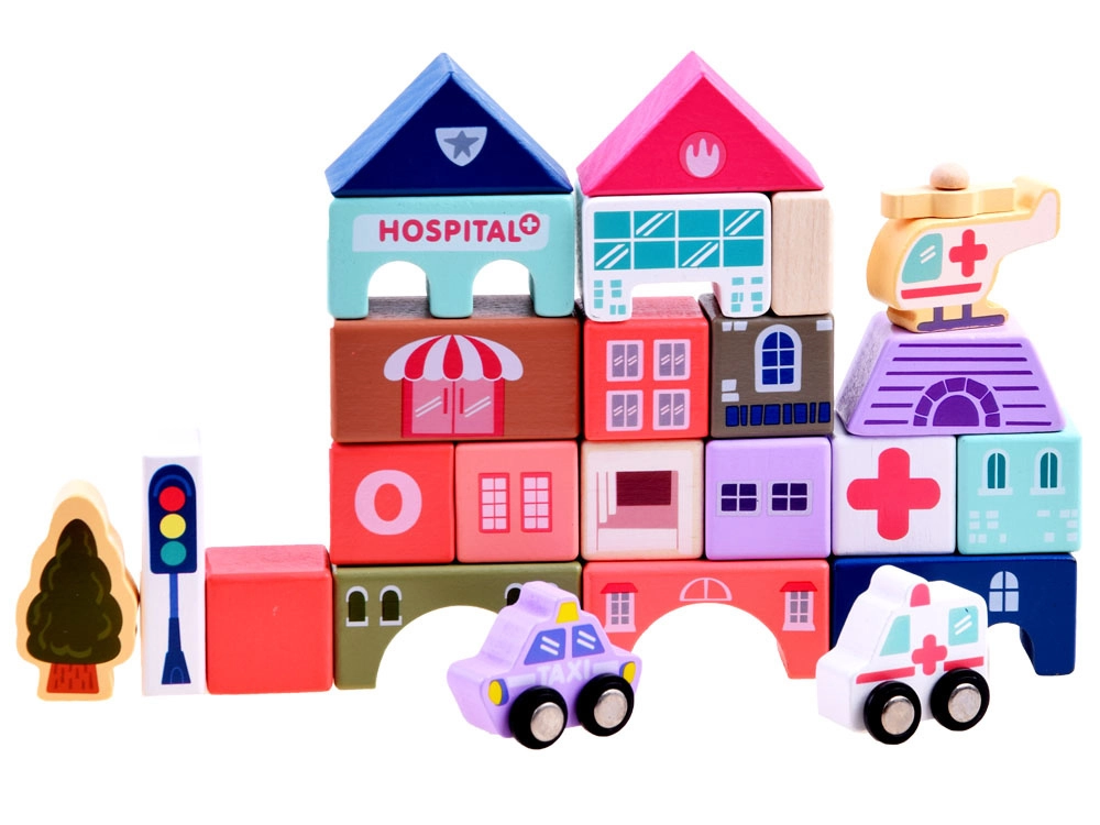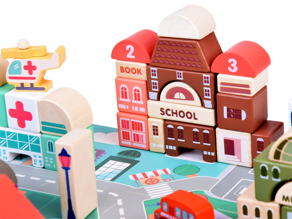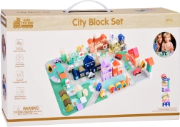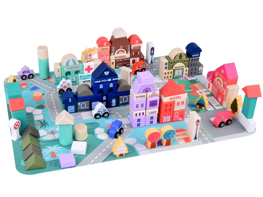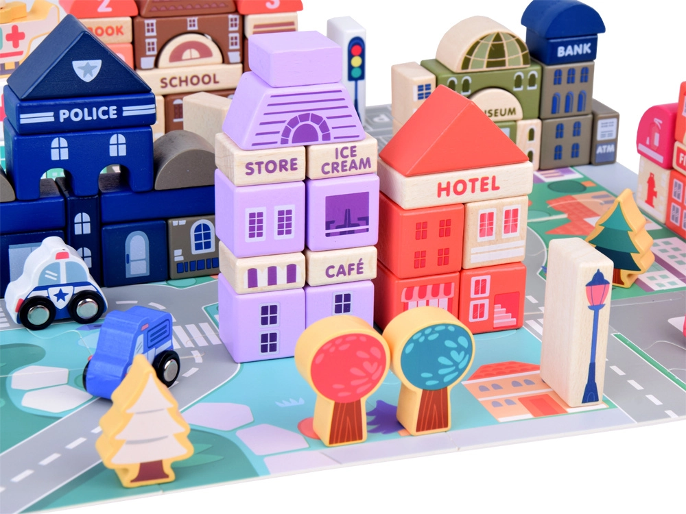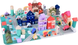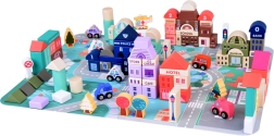 Šis pastelinis rinkinys apima 115 įvairių medinių detalių, tarp jų pastatai, transporto priemonės, medžiai ir kelio ženklai. Vaikai gali pastatyti savo miestą su mokykla, ligonine, banku ir policijos nuovada. Su šiuo konstruktoriu jie lavina ne tik fantaziją, bet ir smulkiąją motoriką.