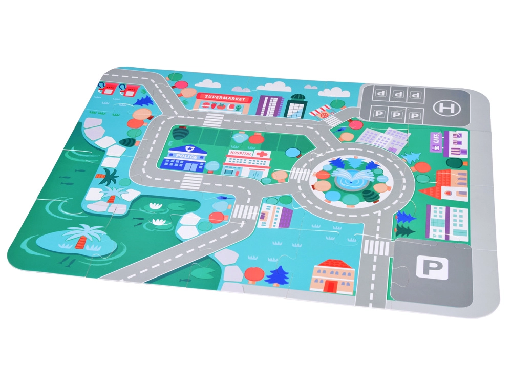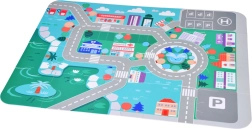 Kilimėlis vaizduoja miesto peizažą su pažymėtais keliais ir stovėjimo vietomis, skatinančiais vaikus mokomuosius žaidimus su transporto priemonėmis.