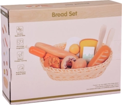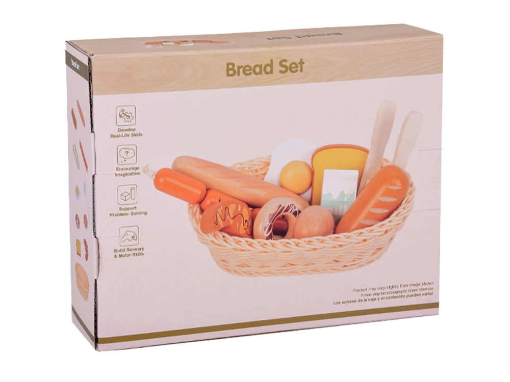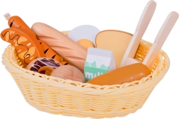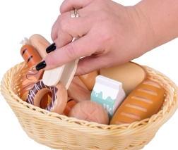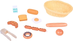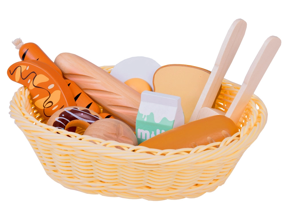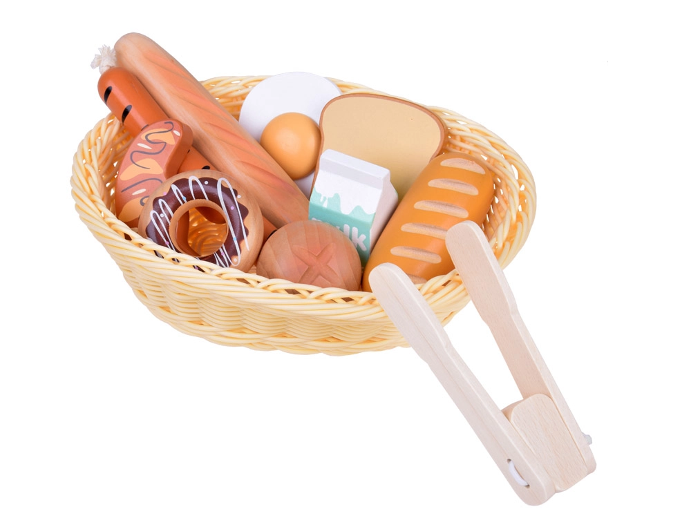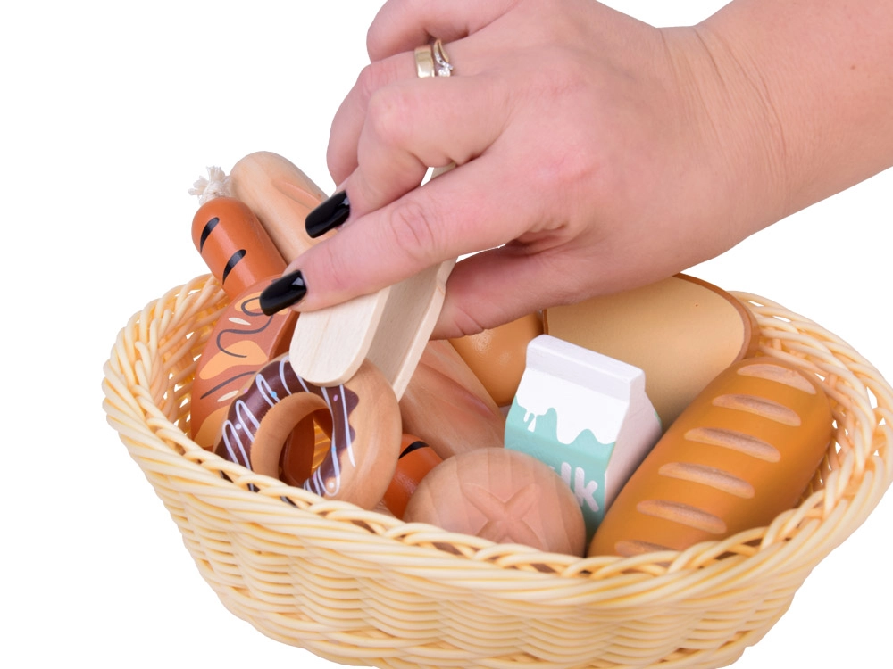 Šis žavus rinkinys žaidimams parduotuvėje ir virtuvėje siūlo įvairų medinio maisto pasirinkimą: kepiniai (bagetė, bandelė, skrebučiai, spurgos), kiaušinis, dešrelės ir pieno pakelis. Kiekvienas elementas kruopščiai pagamintas, malonus liesti ir nudažytas netoksiškais dažais, todėl yra draugiškas vaikams ir planetai. Taip pat pridedamas pintas krepšelis ir medinės žnyplės serviravimui.