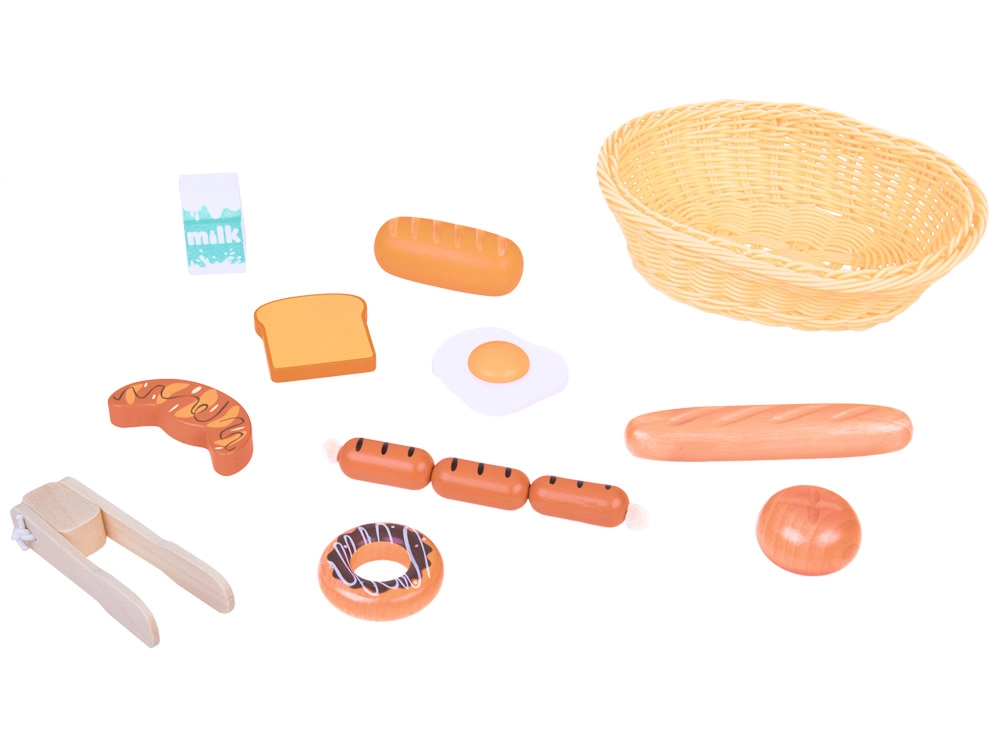 - Keptas kiaušinis, bandelė, pailga bandelė, bagetė, skrebutis, dešrelės, pienas, kruasanas, spurga, medinės žnyplės, pintas krepšelis