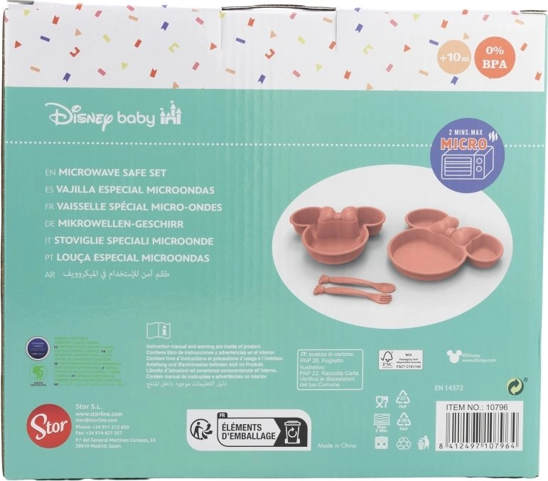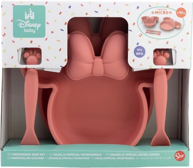 Šis keturių dalių Minnie Mouse valgymo rinkinys suteiks kiekvienam jūsų vaiko valgymui linksmumo. Jame yra lėkštė, dubuo ir stalo įrankių rinkinys (šaukštelis ir šakutė), kurie puikiai tinka vaikams.