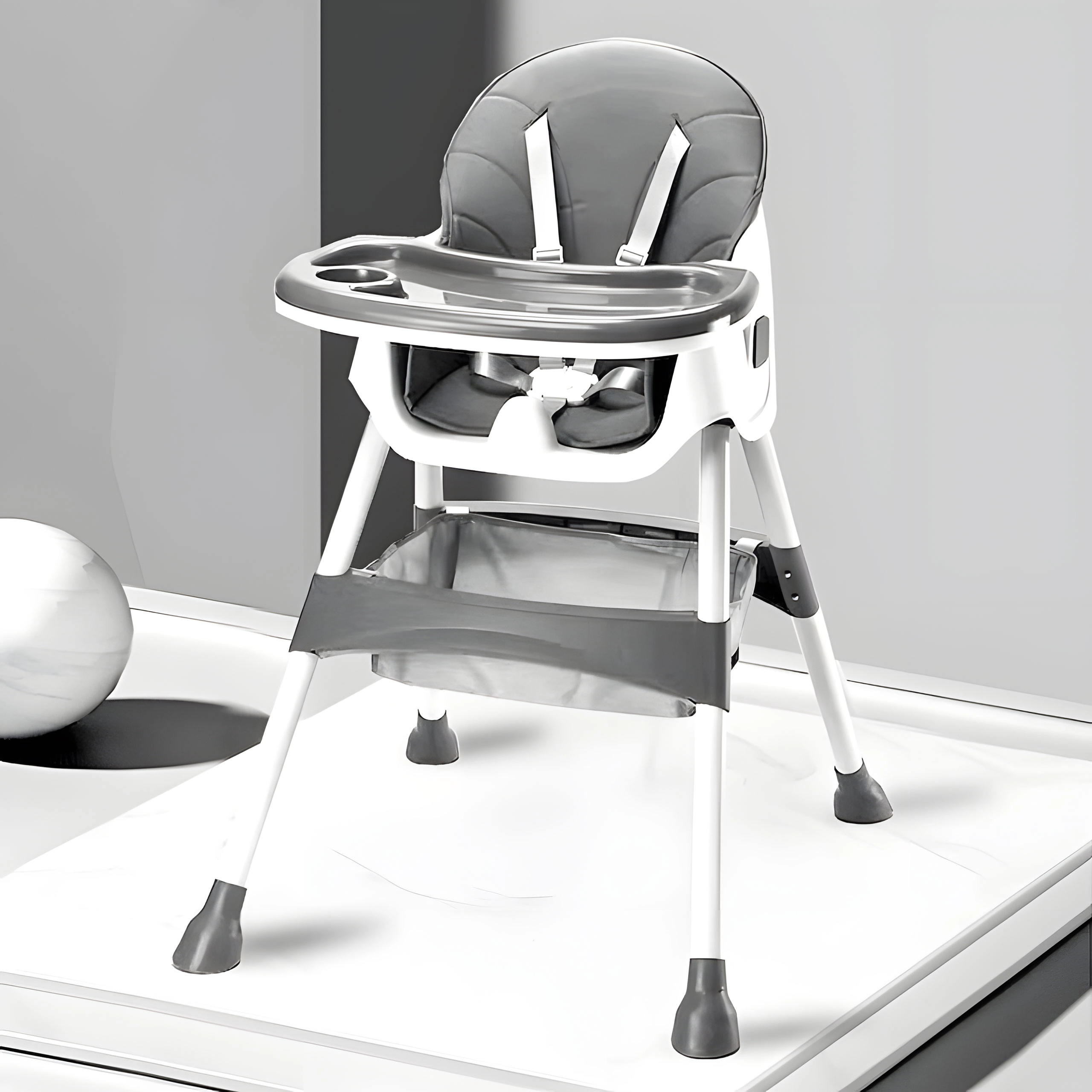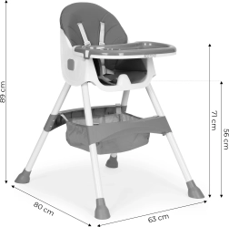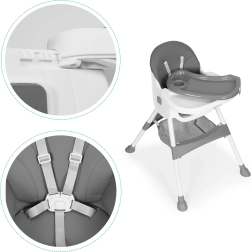 Saugumą užtikrina 5 taškų diržas ir stabilios metalinės kojelės su neslystančiais antgaliais. Nuimamas dvisluoksnis padėklas turi paaukštintus kraštus ir puodelio laikiklį, viršutinį sluoksnį galima plauti indaplovėje. Lankstoma konstrukcija taupo vietą, o krepšelis po sėdyne leidžia seilinukus, servetėles ir žaislus laikyti visada po ranka.