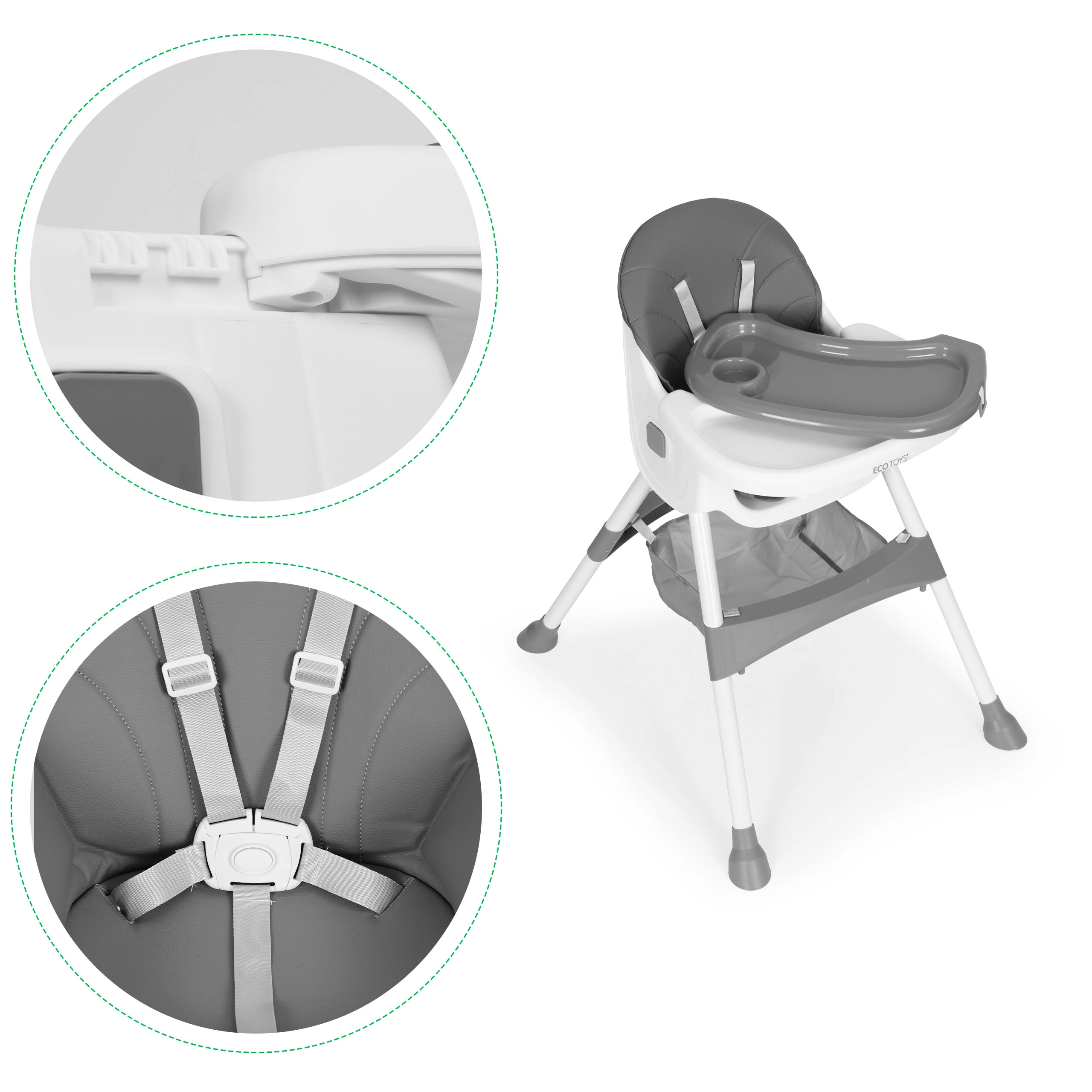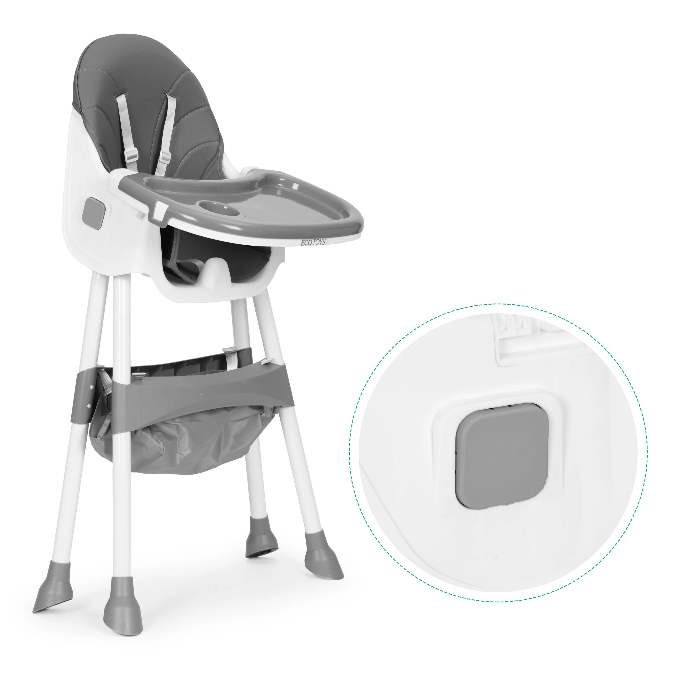 Praktiška vaikiška valgomoji kėdutė ECOTOYS, tinkama vaikams nuo 6 iki 36 mėnesių, sujungia stabilią konstrukciją, lengvai valomą eko odos apmušalą ir dvisluoksnį nuimamą padėklą, tinkamą plauti indaplovėje. Ji siūlo 5 taškų saugos diržą, neslystančias kojeles, lankstomą konstrukciją ir praktišką krepšelį po sėdyne. Didžiausia leistina apkrova – 20 kg.