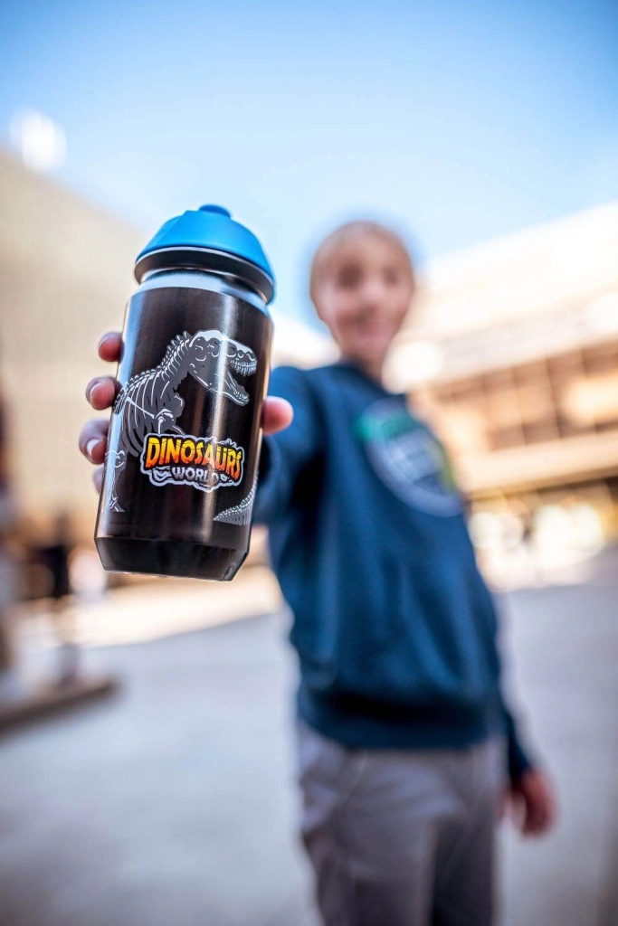 Mėgstamas vaikiškas buteliukas su dinozaurų kaulų dizainu ir užrašu Dinosaurs World patiks mažiesiems priešistorės gerbėjams ir padės patogiai papildyti skysčių atsargas visą dieną. Patogus dizainas su saugiu dangteliu palengvina gėrimą kelionėse ir mokykloje.