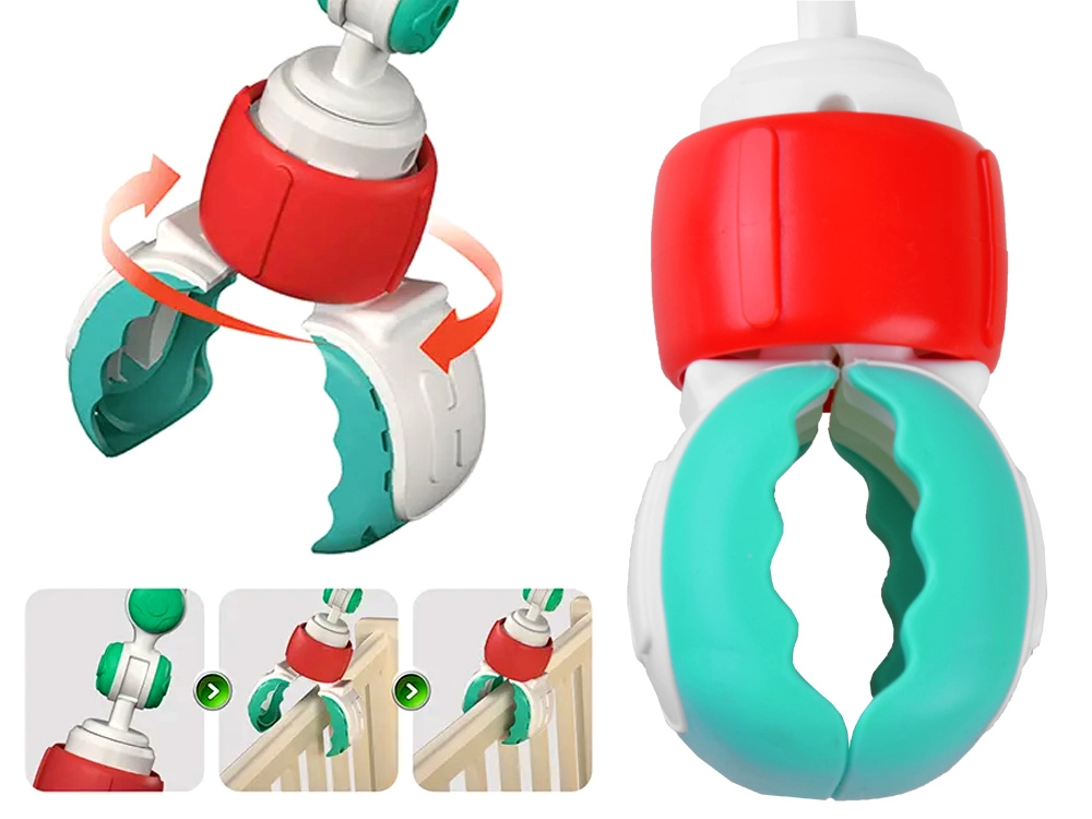 Praktiški spaustukai leidžia greitai pritvirtinti prie vežimėlio, lovytės ar automobilinės kėdutės, todėl pramogas pasiimsite visur.