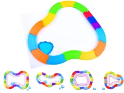 Yra spirografo dalys, bėgelio segmentai, 3 flomasteriai, A4 popierius ir iliustruotas vadovas – atidarykite ir kurkite.