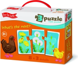 Far Far Land dėlionės trijulės siūlo linksmą ir edukacinę veiklą vaikams. Kiekvienoje pakuotėje yra 8 unikalūs dėlionių paveikslėliai, sudaryti iš trijų dalių, vaizduojančių daiktus, priklausančius tai pačiai rinkiniui.