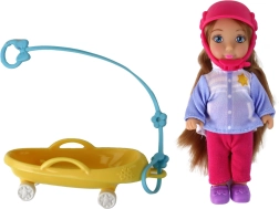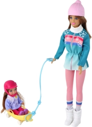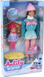 Atraskite žiemos magiją su mama ir dukra ant rogutės. Didelė lėlė turi ilgus rudus plaukus ir šiltą kepurę, o maža lėlytė dėvi rožinį šalmą saugesniam žaidimui. Pasteliniai žieminiai drabužėliai su snaigėmis pabrėžia apsnigtų nuotykių atmosferą, o geltonos rogės kviečia į begalinius nusileidimus.