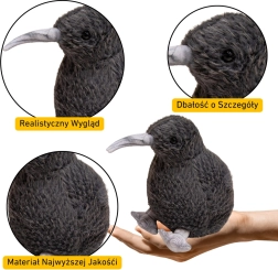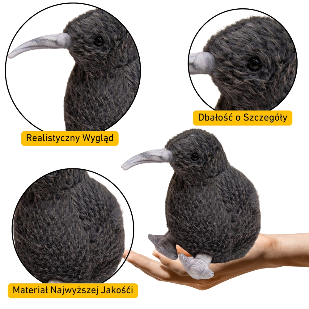 Šis pliušinis kivio talismanas elegantiškos juodos spalvos išsiskiria tikrovišku atlikimu ir švelniu paviršiumi, kuris tiesiog kviečia apkabinti. Dėl kruopščiai apgalvotų detalių – ilgo snapo, smulkių kojyčių ir purios tekstūros – jis atrodo labai įtikinamai ir taps mėgstamu bičiuliu vaikams nuo 3 metų.