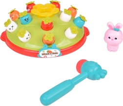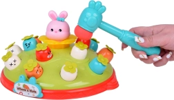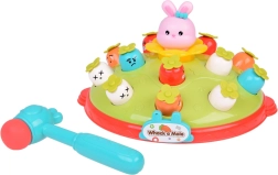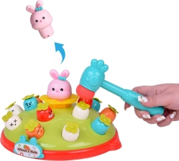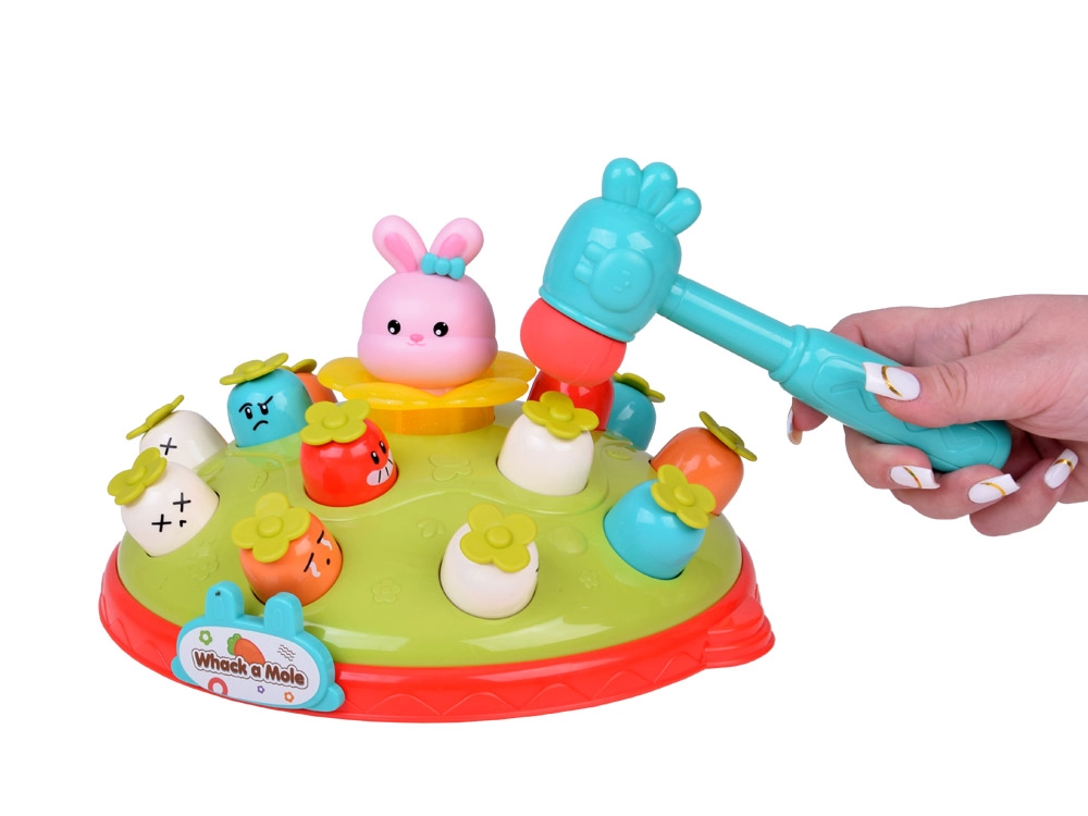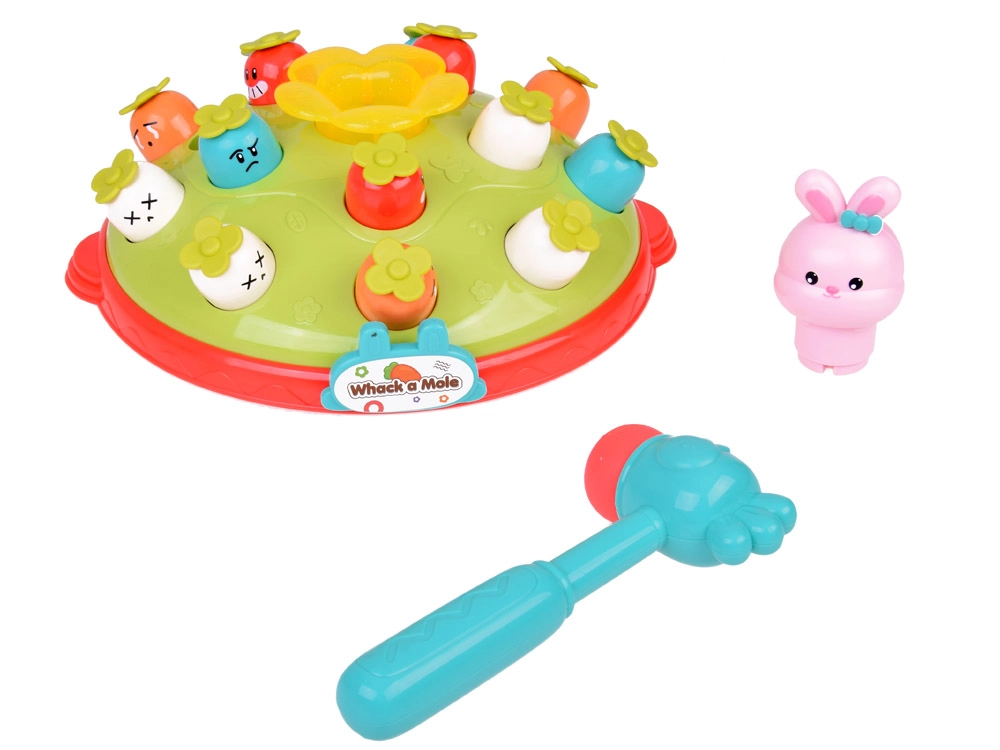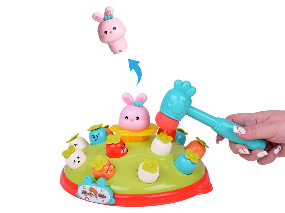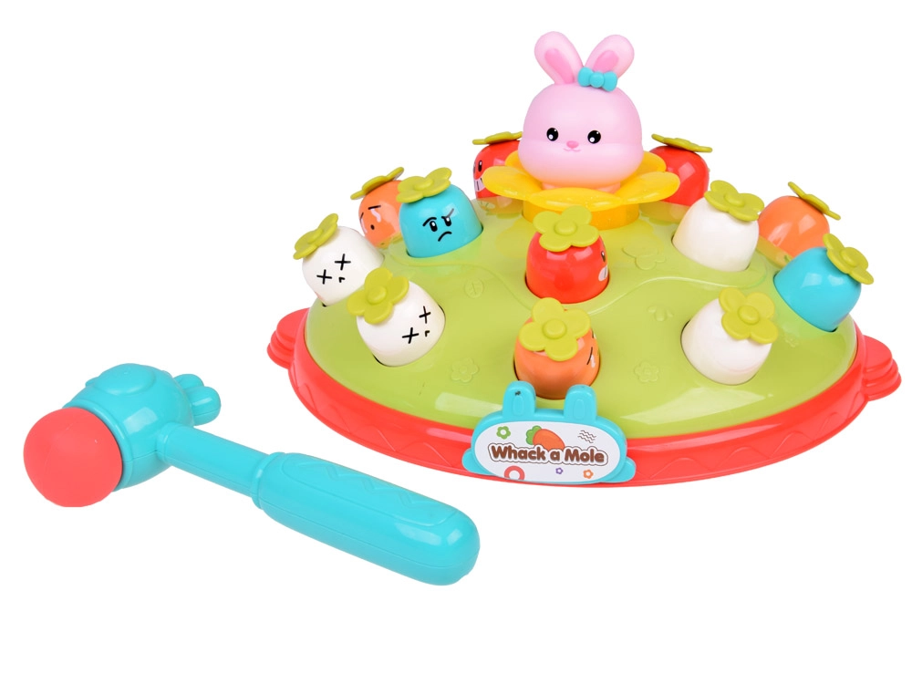 Žaidimas „Plokštelėk plaktuku“ suteikia vaikams galimybę lavinti motorinius įgūdžius smagioje aplinkoje. Ant spalvingos, pievelę primenančios platformos išdėliotos skirtingų spalvų ir išraiškų morkytės bei rožinis kiškučis, kurio užduotis – iššokti, kai pataikoma plaktuku. Žaidimą lydi linksma melodija, kuri traukia vaikų dėmesį. Platformoje yra du morkyčių lygiai ir sumanus mechanizmas: pasukus kiškučio detalę, iš viršutinio lygio iššoka kita morkytė.