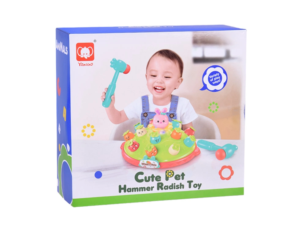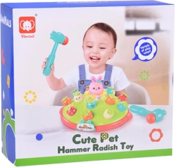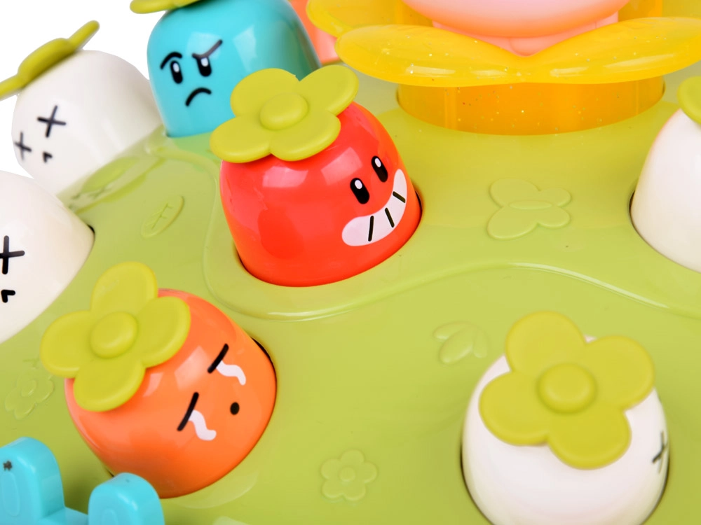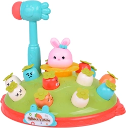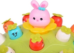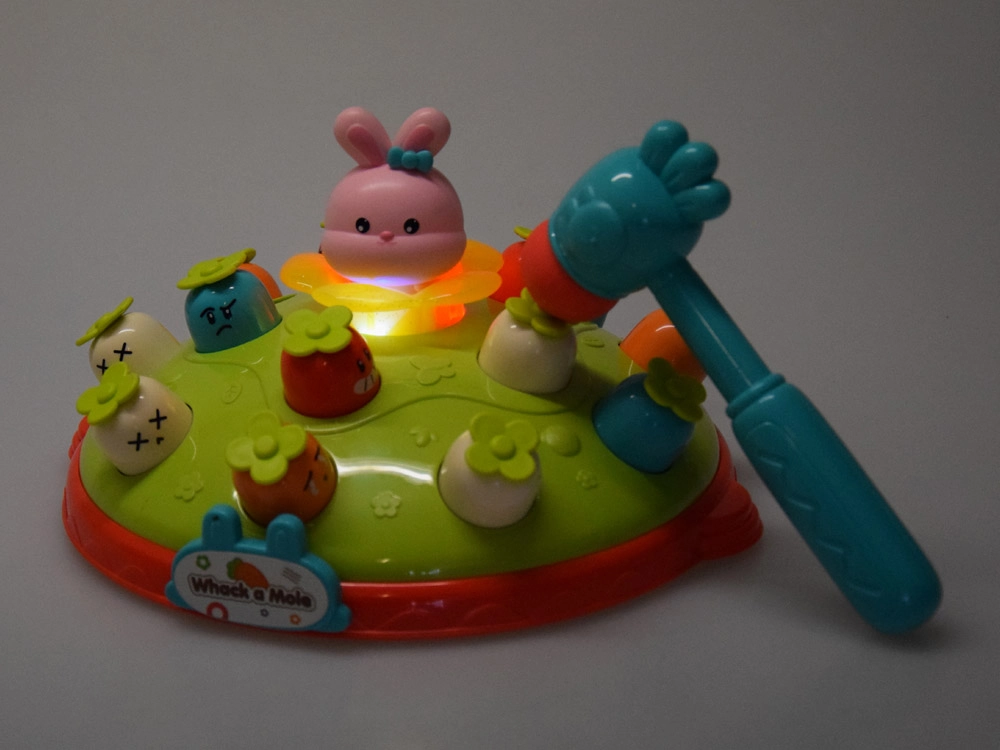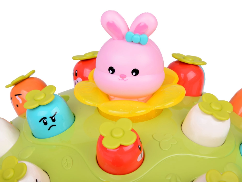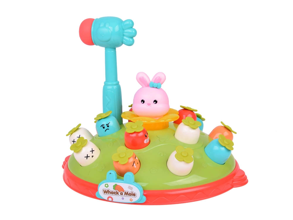 Žaidimas „Plokštelėk plaktuku“ suteikia vaikams galimybę lavinti motorinius įgūdžius smagioje aplinkoje. Ant spalvingos, pievelę primenančios platformos išdėliotos skirtingų spalvų ir išraiškų morkytės bei rožinis kiškučis, kurio užduotis – iššokti, kai pataikoma plaktuku. Žaidimą lydi linksma melodija, kuri traukia vaikų dėmesį. Platformoje yra du morkyčių lygiai ir sumanus mechanizmas: pasukus kiškučio detalę, iš viršutinio lygio iššoka kita morkytė.