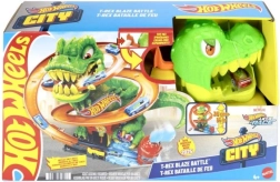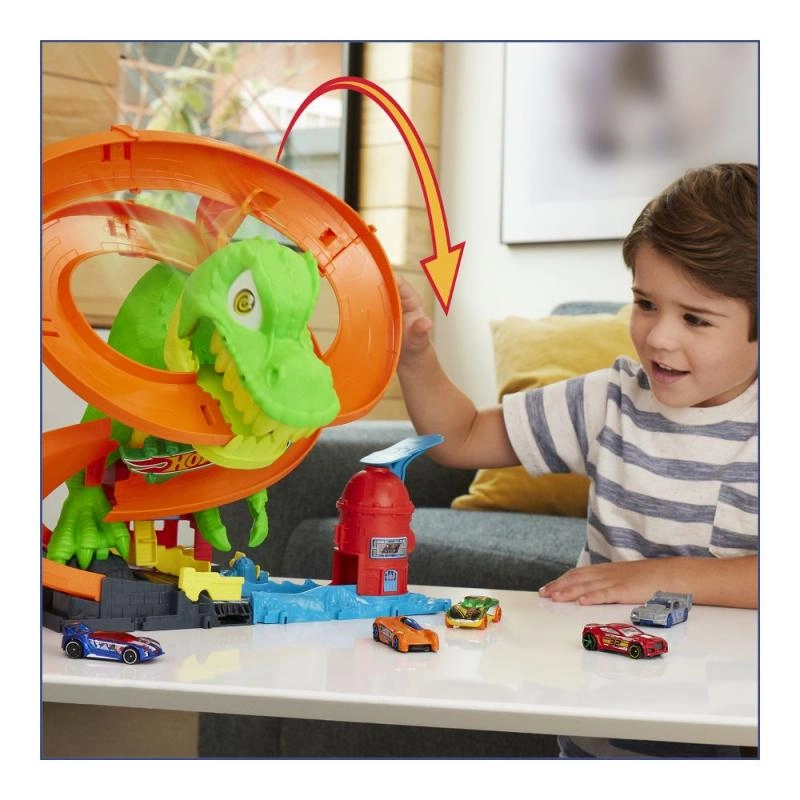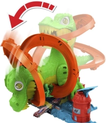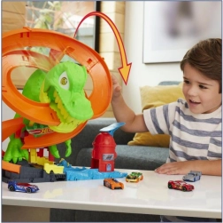 Pasiruoškite jaudinančiam važiavimui Hot Wheels City mieste! Paleiskite pridėtą 1:64 metalinę mašinėlę ir pralėkite pro T‑reksą. Kaskart, kai mašina pravažiuoja, dinozauro akys sukasi, kol galiausiai jis būna nugalėtas. Vaikai gali išbandyti įvairius scenarijus – nuo greito „deglių papildymo“ iki herojiškos pergalės, kuri išgelbsti visą miestą.