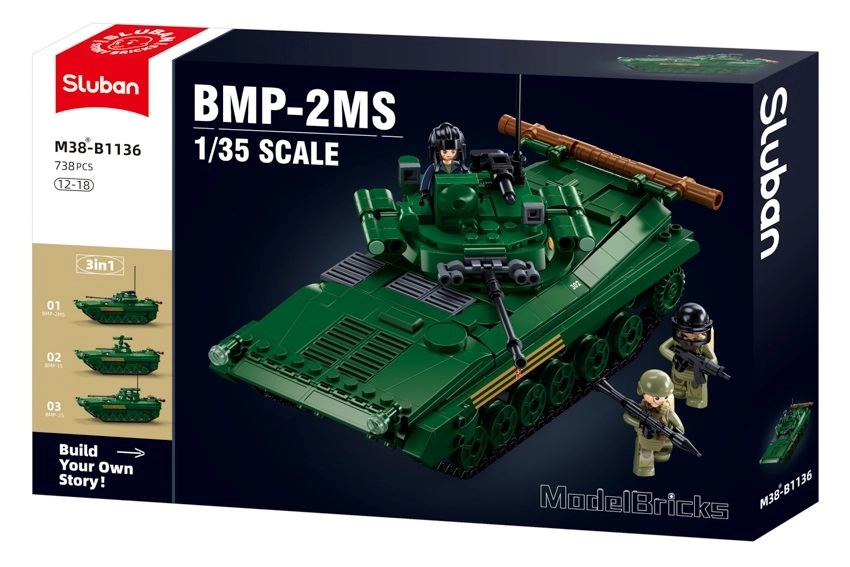 Sluban rinkinį sudaro 738 detalės, su kuriomis galite statyti įvairius modelius, ir jis tinka vaikams nuo 12 metų. Trys pridedamos minifigūrėlės turi pasukamas ir lankstomas dalis, todėl galima kurti realistiškas kovines scenas. Dėl suderinamumo su populiariais prekės ženklais, tokiais kaip Lego, Cobi ar Mega Bloks, turėsite gerokai platesnes statybos galimybes.