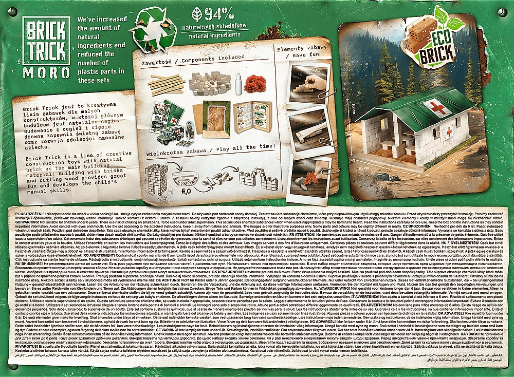 TREFL Brick Trick Moro: Lauko ligoninė XL – tai unikalus konstruktorius, kuris leis jums tapti statytoju ir pastatyti savo ligoninę iš tikrų statybinių medžiagų kopijų. Dėliokite plytą po plytos, pjaukite ir klijuokite medines lenteles ir papuoškite savo statinį dekoracijomis. Šis rinkinys ne tik padės lavinti rankų įgūdžius, bet ir ugdo vaizduotę bei skatina susikaupimą.