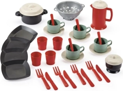 Didelis permatomas krepšys su keturiais lėkštėmis, stalo įrankiais, taurėmis, puodeliais su lėkštutėmis, arbatinuku, cukrine, sieteliu ir puodu su dangčiu. Puikus vaikiškas rinkinys smagiam žaidimui.