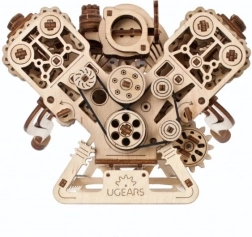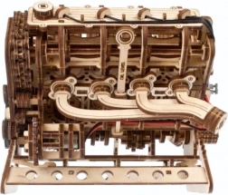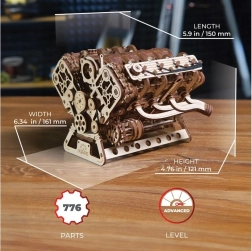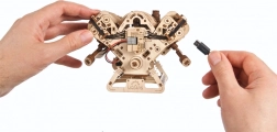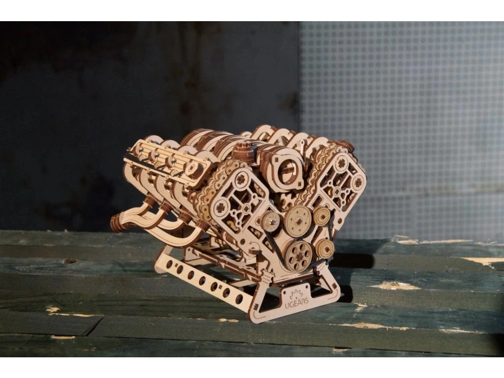 Medinis mechaninis V8 variklio modelis ištikimai atkuria tikro aštuonių cilindrų darbo principus: aštuoni cilindrai su ritmišku stūmoklių darbu, 16 vožtuvų, valdomų skirstymo velenais, paskirstymas su reguliuojama grandine (32 nareliai) ir priedai, varomi gyvatele primenančiu diržu. Maitinant per USB‑C arba sukant ranka, mėgausitės realistiškais mechaniniais judesiais ir geriau suprasite vidaus degimo variklio principus.