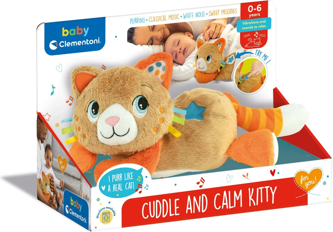 Ši švelni plišinė kačiukė iš CLEMENTONI BABY sukurta taip, kad suteiktų vaikams paguodą ir padėtų užmigti. Vibracijos realistiškai imituoja katės murkimą, kas skatina atsipalaidavimą, o raminantys garsai (klasikinė muzika, baltasis triukšmas ir saldžios melodijos) kuria malonią miego atmosferą.