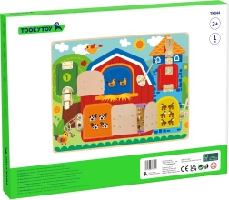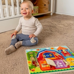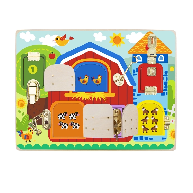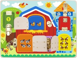 Atraskite linksmą ir lavinamąjį žaislą vaikams nuo 3 metų: medinę veiklos lentą su fermos motyvu iš Tooky Toy. Šešios spalvotos durelės su įvairiomis spynomis, kabliukais ir grandinėlėmis lavina smulkiąją motoriką, loginį mąstymą ir akių–rankų koordinaciją, o po durelėmis slepiasi gyvūnėlių paveikslėliai kaip maloni staigmena.