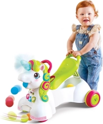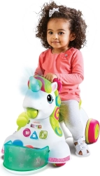 Atraskite universalų 3 viename stumduką ir vaikštynę – vienaragį, kuris padeda žengti pirmuosius žingsnius, lavina motoriką ir suteikia smagų mokymąsi. Vaikas pradeda nuo žaidimų centro (apie 6 mėn.+), tęsia stumdamas už rankenos (apie 12 mėn.+), o vėliau pereina prie važiavimo sėdint (apie 16 mėn.+). Spalvota karčiai su įvairiomis tekstūromis stimuliuoja pojūčius, o apšviesti mygtukai moko spalvų, formų ir skaičių.
