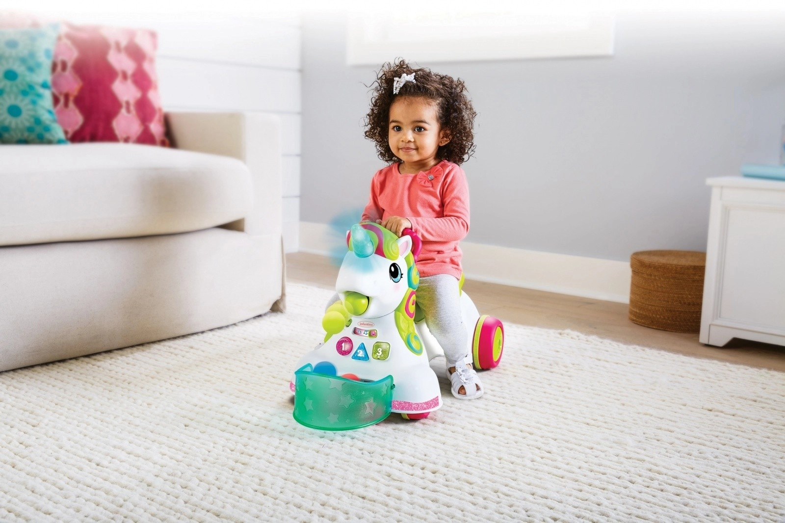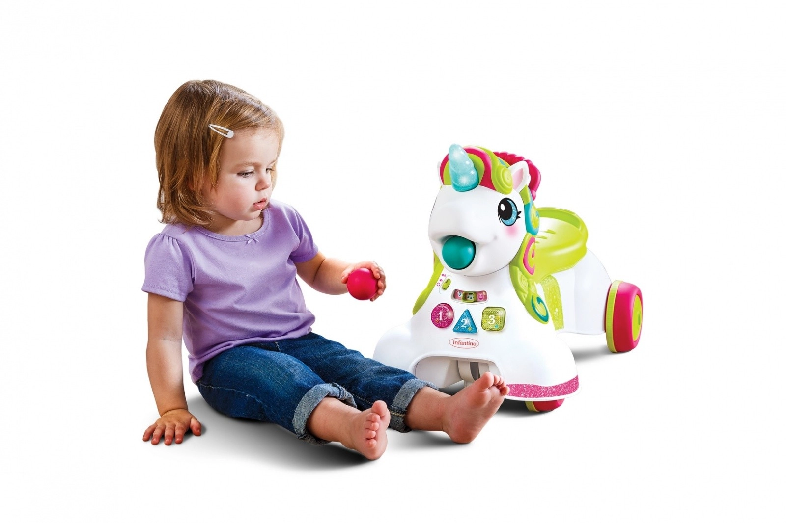 Linksmas 3 viename INFANTINO vienaragio formos stumdukas ir vaikštynė auga kartu su vaiku: veikia kaip žaidimų centras, stumdoma vaikštynė ir važiuojamas žaislas. Siūlo daugiau nei 20 šviesos ir garso efektų, apšviestus mygtukus su skaičiais, spalvomis ir formomis, reguliuojamą ratų greitį ir minkštą šviečiantį ragą, reaguojantį į prisilietimą. Komplekte yra 5 spalvoti kamuoliukai ir patogios daiktų dėtuvės.