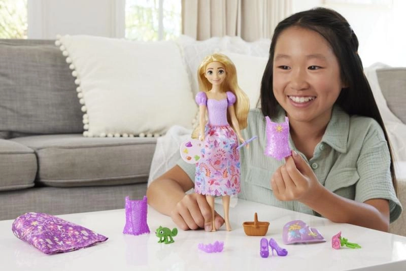 - Lengvai aprengiama Rapunzelės lėlė turi du lengvai prisegamus korsetus, du sijonus su jos istorijos atspaudais ir devynis teminius aksesuarus.