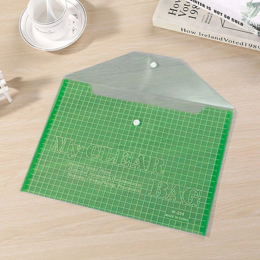 Permatomas A4 dokumentų vokas su spaude žalia spalva patikimai saugo dokumentus nuo lankstymosi ir nešvarumų. Pagamintas iš patvaraus polipropileno (PP), siūlo saugų užsegimą, tikslius A4 formato matmenis ir praktišką pakuotę po 20 vnt. – idealu biurui, mokyklai ir namams.