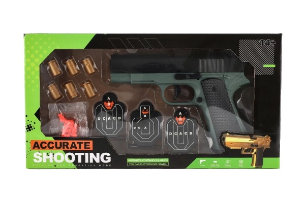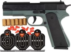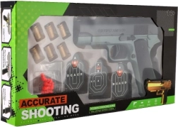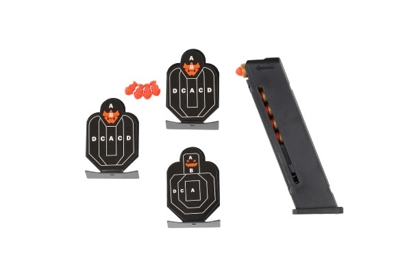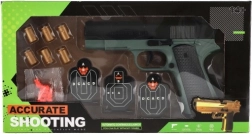 Apsiginkluok šiuo putplasčio kulkų pistoletu ir išbandyk savo taiklumą šaudydamas į taikinį. Rinkinyje yra 6 kulkos ir 3 taikiniai maksimaliai pramogai.