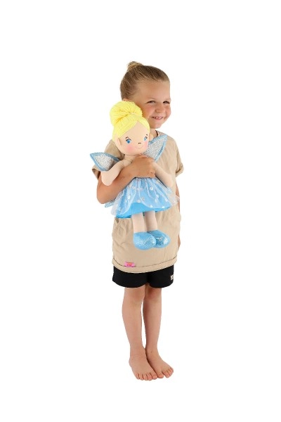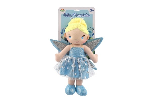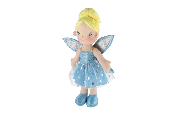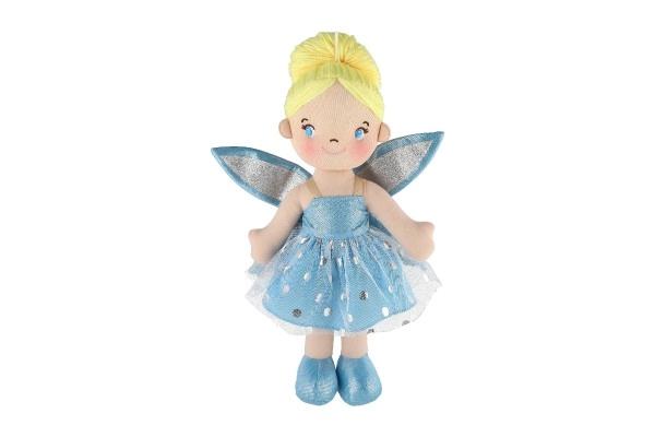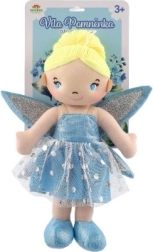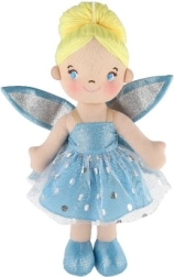 Lėlytė vilki mėlyną suknelę su blizgančiais sparnais, kurie suteikia tikrą pasakišką įvaizdį.