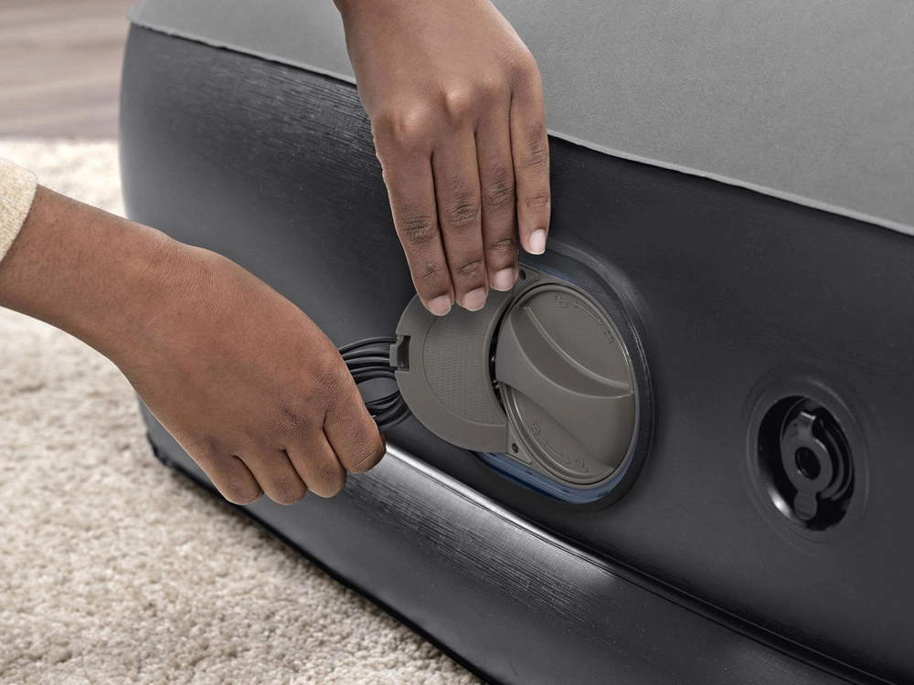 Integruotas USB siurblys pripučia lovą per 5–6 minutes ir suderinamas su AC/DC adapteriais bei išorinėmis baterijomis – idealu keliaujant. Integruota pagalvė ir malonus, rumbuotas paviršius didina miego komfortą; 152 × 203 cm dydis patogiai talpina du suaugusiuosius.