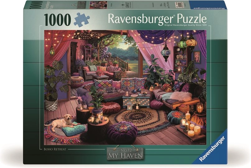 Ravensburger dėlionė Mano jaukus boho prieglobstis iš 1000 dalių garantuoja valandų pramogą visiems dėlionių mėgėjams. Idealiai tinka poilsiui ir pabėgimui į jūsų jaukią boho erdvę.