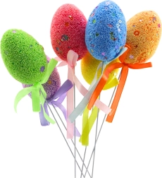Sukurkite linksmą pavasarinę puošybą akimirksniu. Rinkinyje yra 6 dekoratyviniai kiaušiniai ant smeigtukų įvairių spalvų, kurie gražiai išryškėja vazoje su šakelėmis, vazone ar pintuose komponavimuose. Lengvas polistirenas su paviršiumi, nusėtu granulėmis ir smulkiais raštais, atrodo žaismingai ir kartu elegantiškai.
