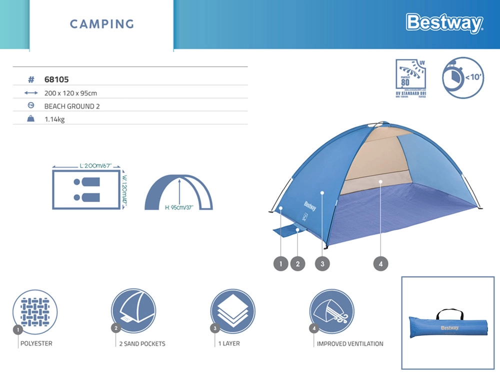 Paplūdimio palapinė Bestway Beach Ground 2 sukurta visiems, kurie nori mėgautis diena paplūdimyje be intensyvios saulės spinduliuotės. Ji siūlo paprastą sprendimą, suteikiantį šešėlį karštomis vasaros dienomis ir patogią vietą visiems paplūdimio aksesuarams laikyti.
