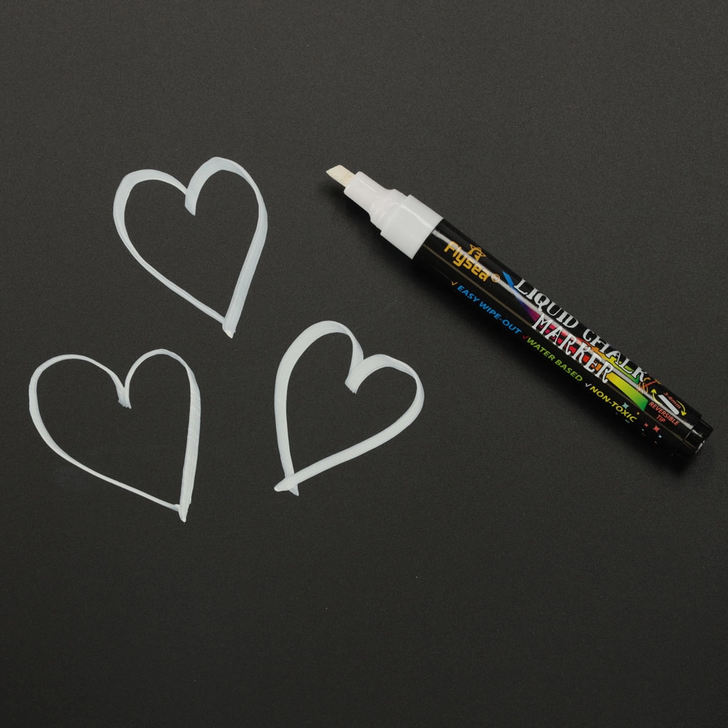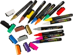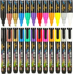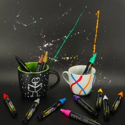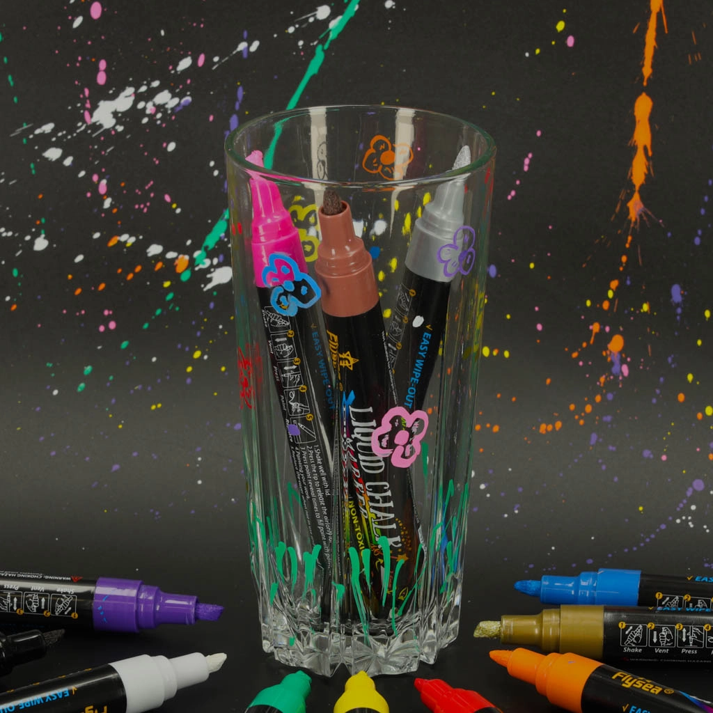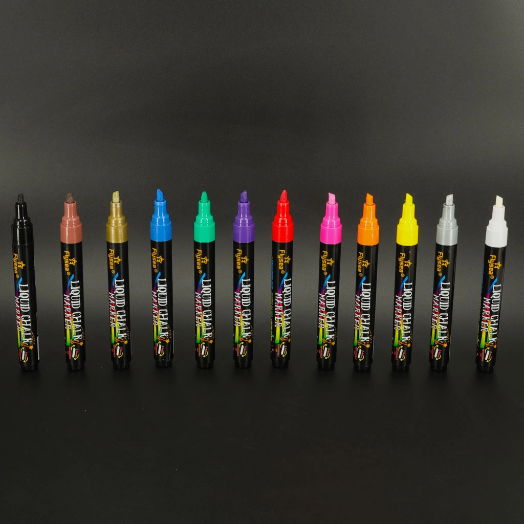 Pakuotėje rasite 12 sodrių atspalvių, įskaitant baltą, juodą, auksinę ir sidabrinę – puikiai tinka paryškinimams ir dekorui. Žymekliai yra bedulkiai, netoksiški ir tinkami pakartotiniam naudojimui ant stiklo, lentų, vitrinų, keraminių puodelių ar plastikinių paviršių.