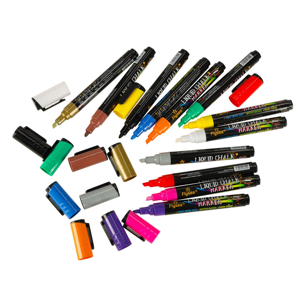 Su šiuo skystų kreidinių žymeklių rinkiniu sukursite įtraukius užrašus, meniu, iškabas ir kūrybinius piešinius ant visų neporėtų paviršių. Vandens pagrindo dažai yra saugūs vaikams, bekvapiai ir nusivalo per akimirką. Dvipusis galiukas leidžia kurti tikslias detales ir ryškius brūkšnius puikiam įskaitomumui.