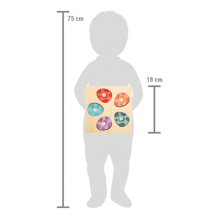 Šis tvirtas, ryškių spalvų medinis žaislas pradžiugins visus mažus dinozaurų mylėtojus. Po šešiais kiaušiniais slepiasi šeši atitinkamų spalvų mediniai dinozaurai, tad vaikai gali lavinti atmintį ir rūšiavimą pagal atitikmenis. Žaidimas idealiai tinka pirmajai pažinčiai su dėlionėmis dėl patogių sagos tipo rankenėlių.
