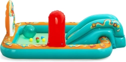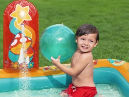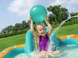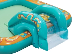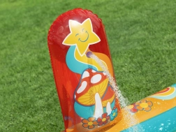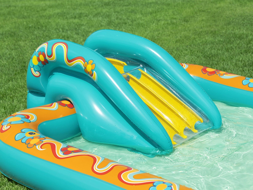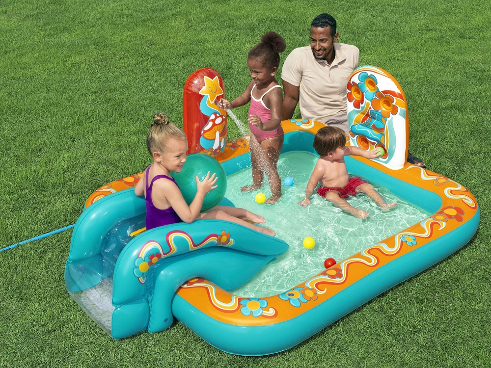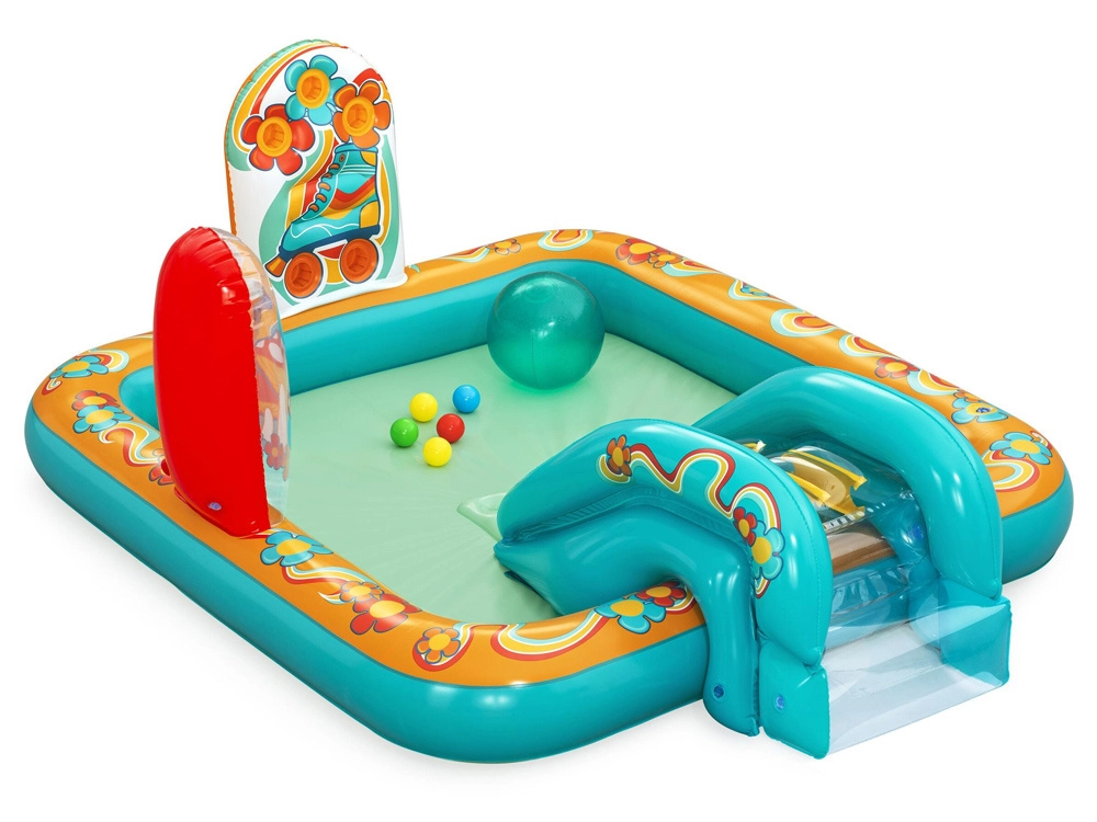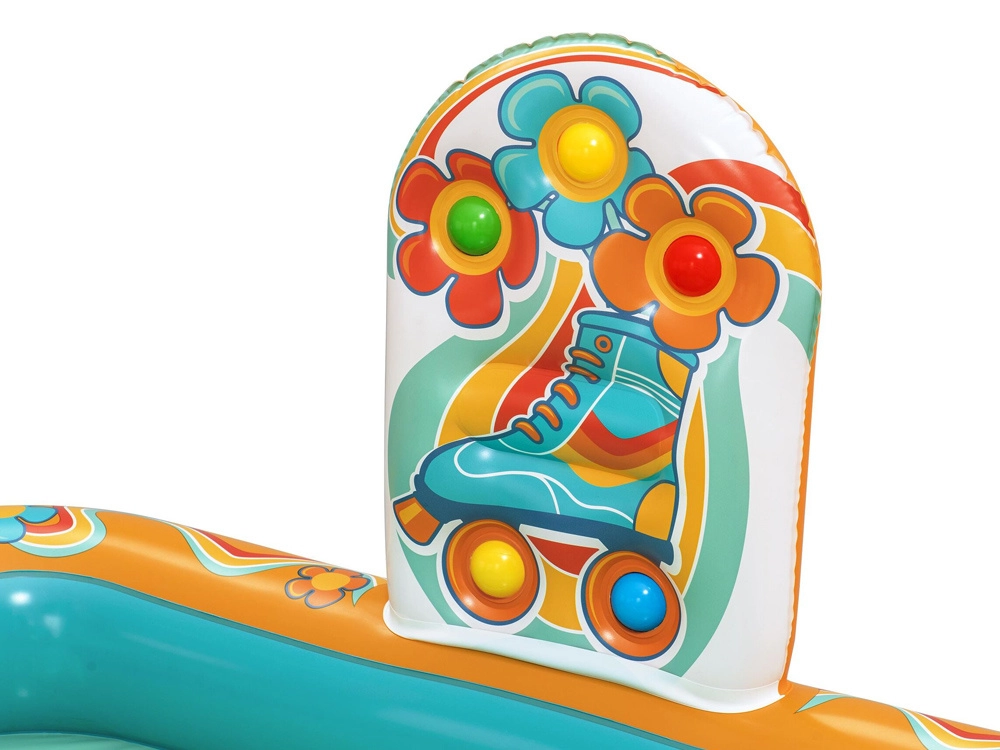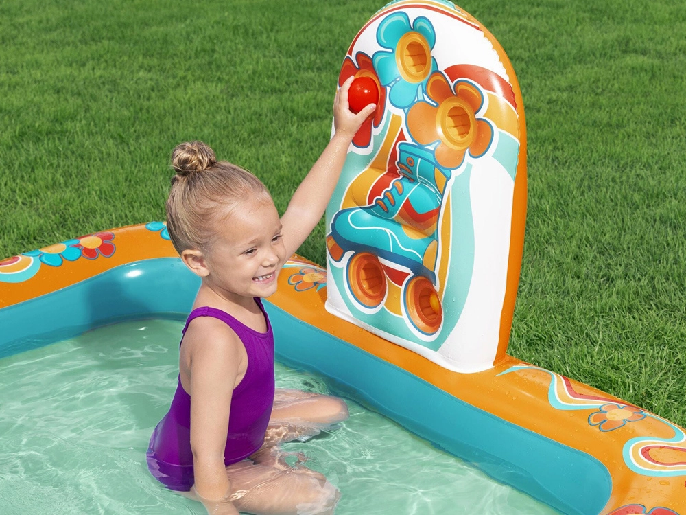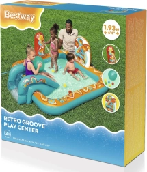 Pripučiamas žaidimų centras BESTWAY Retro Groove pavers jūsų sodą spalvinga vandens žaidimų aikštele. Stabili, prie dugno tvirtai pritvirtinta čiuožykla veda į seklų baseinėlio plotą, o už gaivą atsako vandens purkštukas, kurį lengvai prijungsite prie žarnos. Retro grafika ir priedai, tokie kaip kamuoliukai ir paplūdimio kamuolys, skatina kūrybišką žaidimą ir motorikos vystymą.