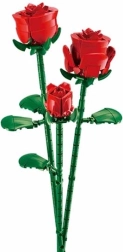 Sukonstruokite tris sodriai raudonas rožes su žaliais stiebais ir lapais ir pademonstruokite jas baltoje cilindrinėje vazoje. Rezultatas – laikui nepavaldi dekoracija, kuri papuoš lentyną ar darbo stalą.