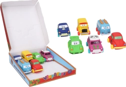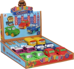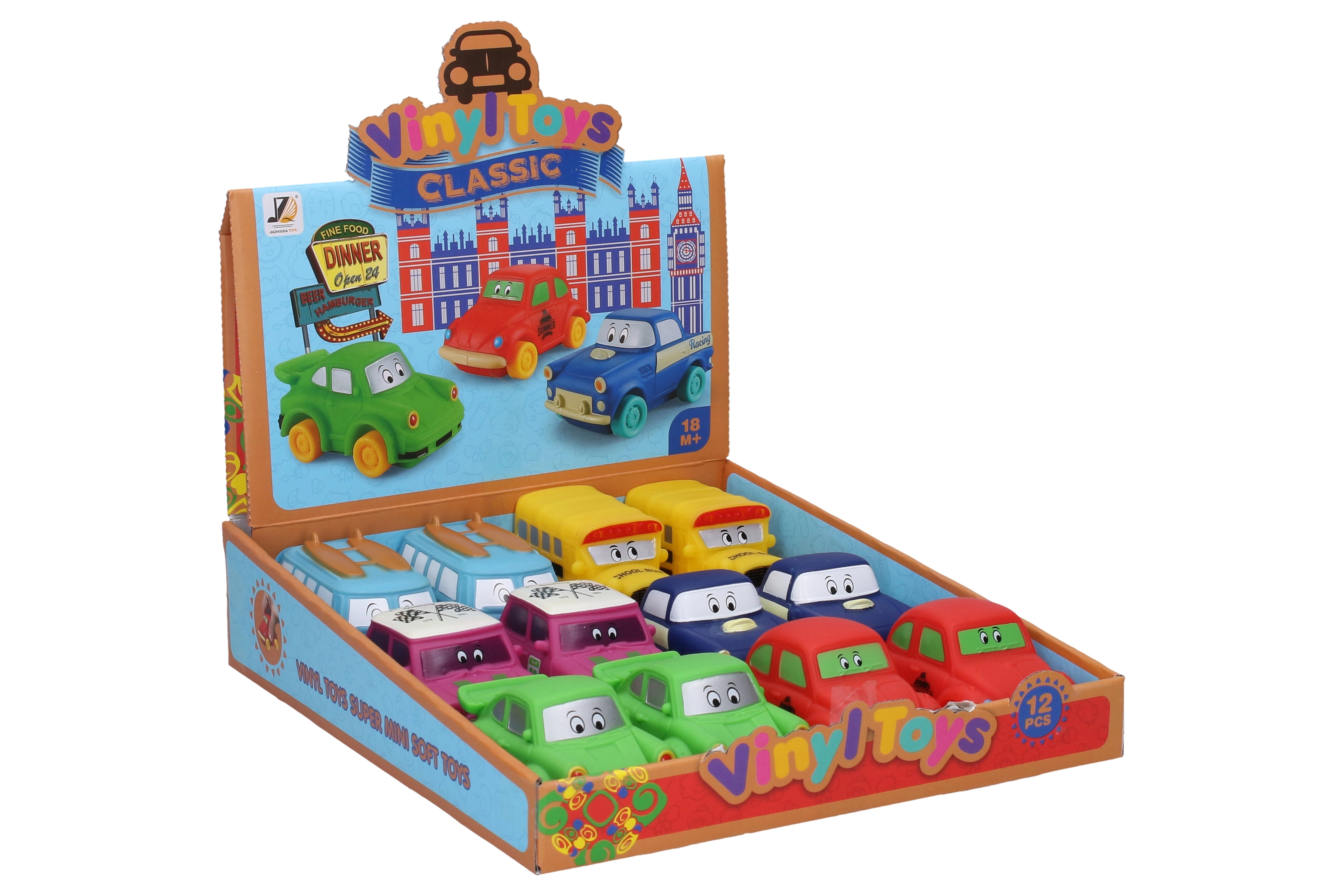 Lengvas automobiliukas iš minkšto plastiko, 9 cm ilgio, su laisvai riedančiais ratais. Galima rinktis iš 6 variantų: Vabalas, Trabantas, sportinis, Mini, autobusas, furgonas.
