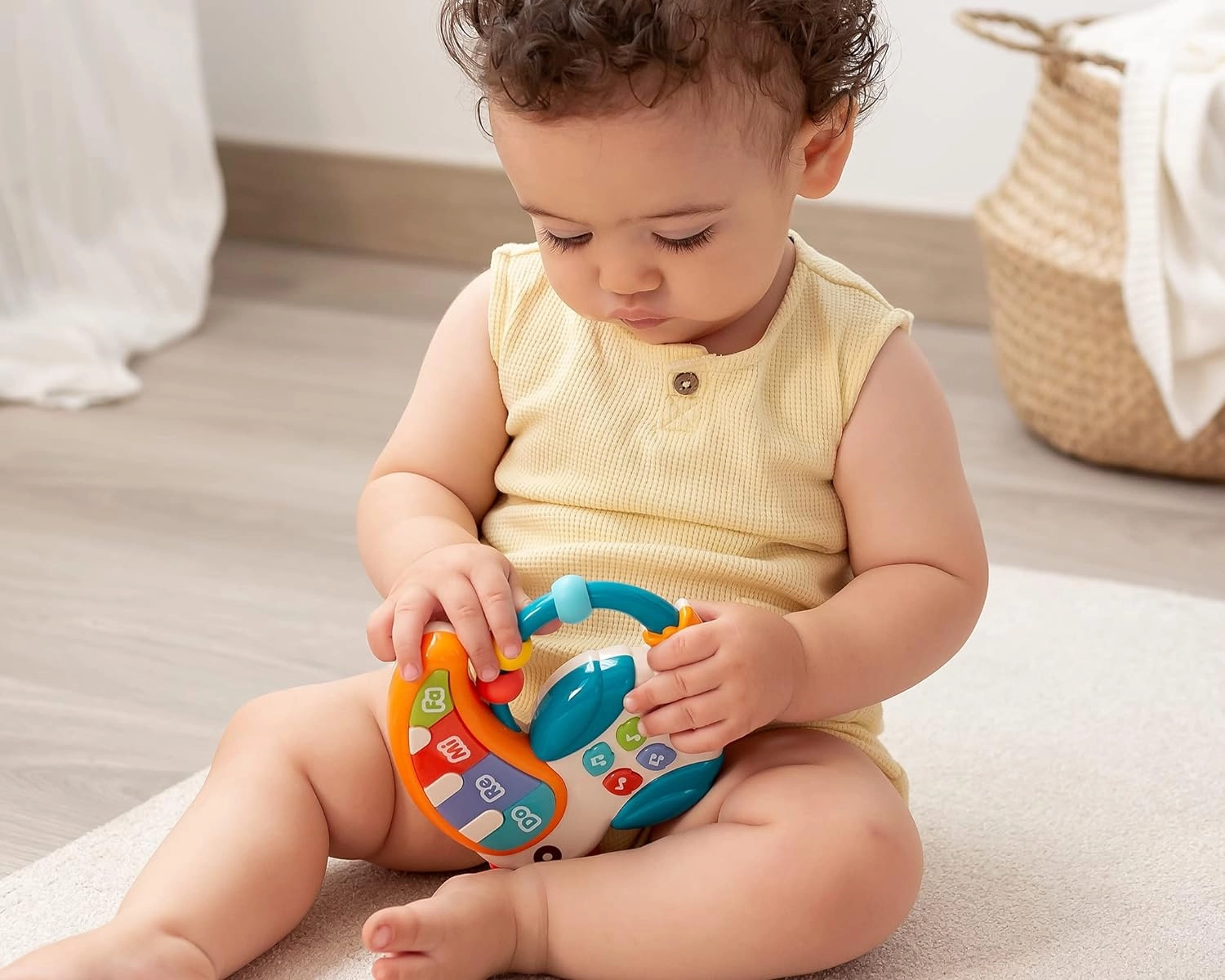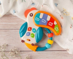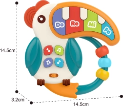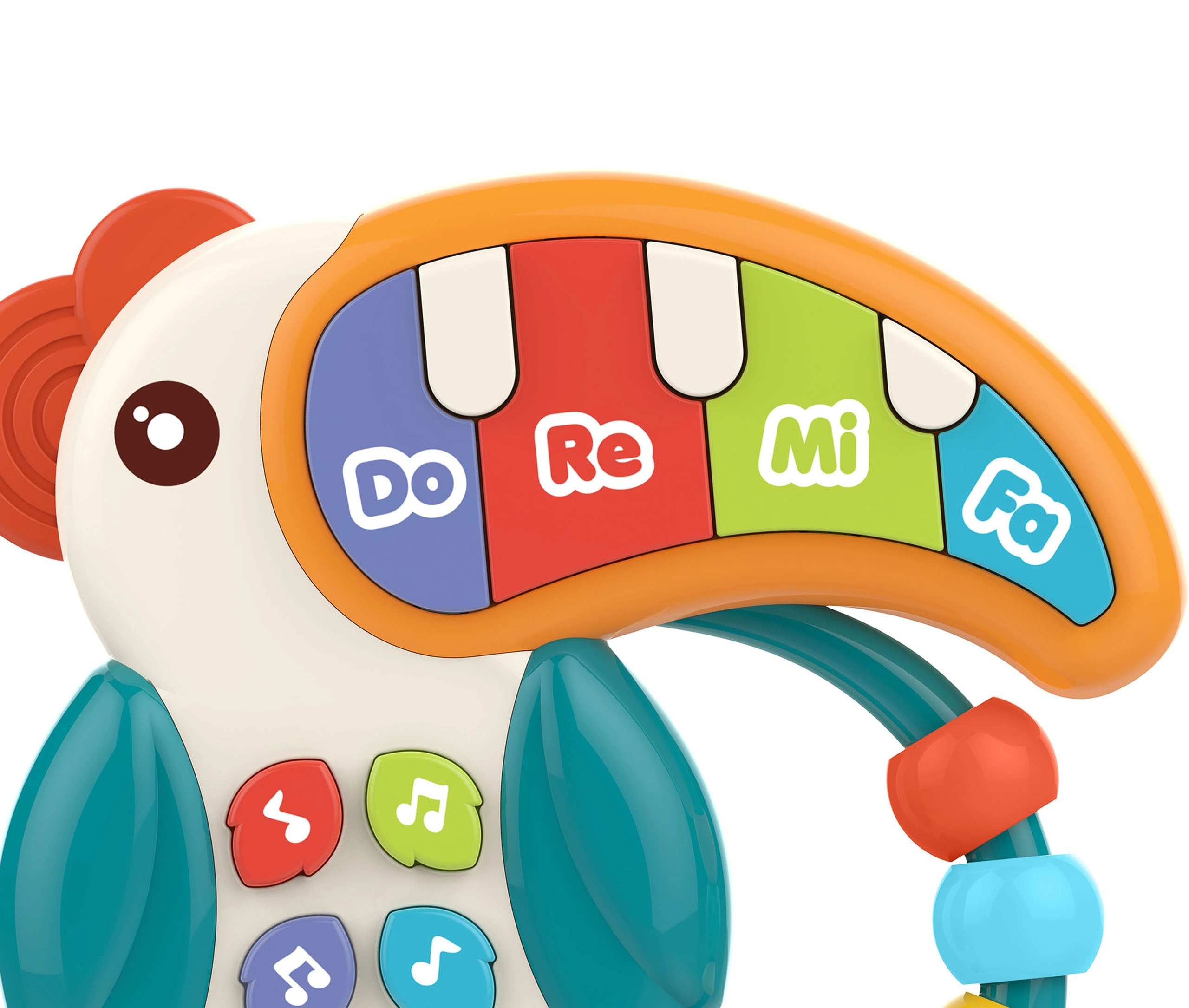 Keturi spalvoti klavišai groja garsus ir trumpas melodijas, kurios lavina ritmą, klausą ir pirmuosius muzikinio pasaulio žingsnius.