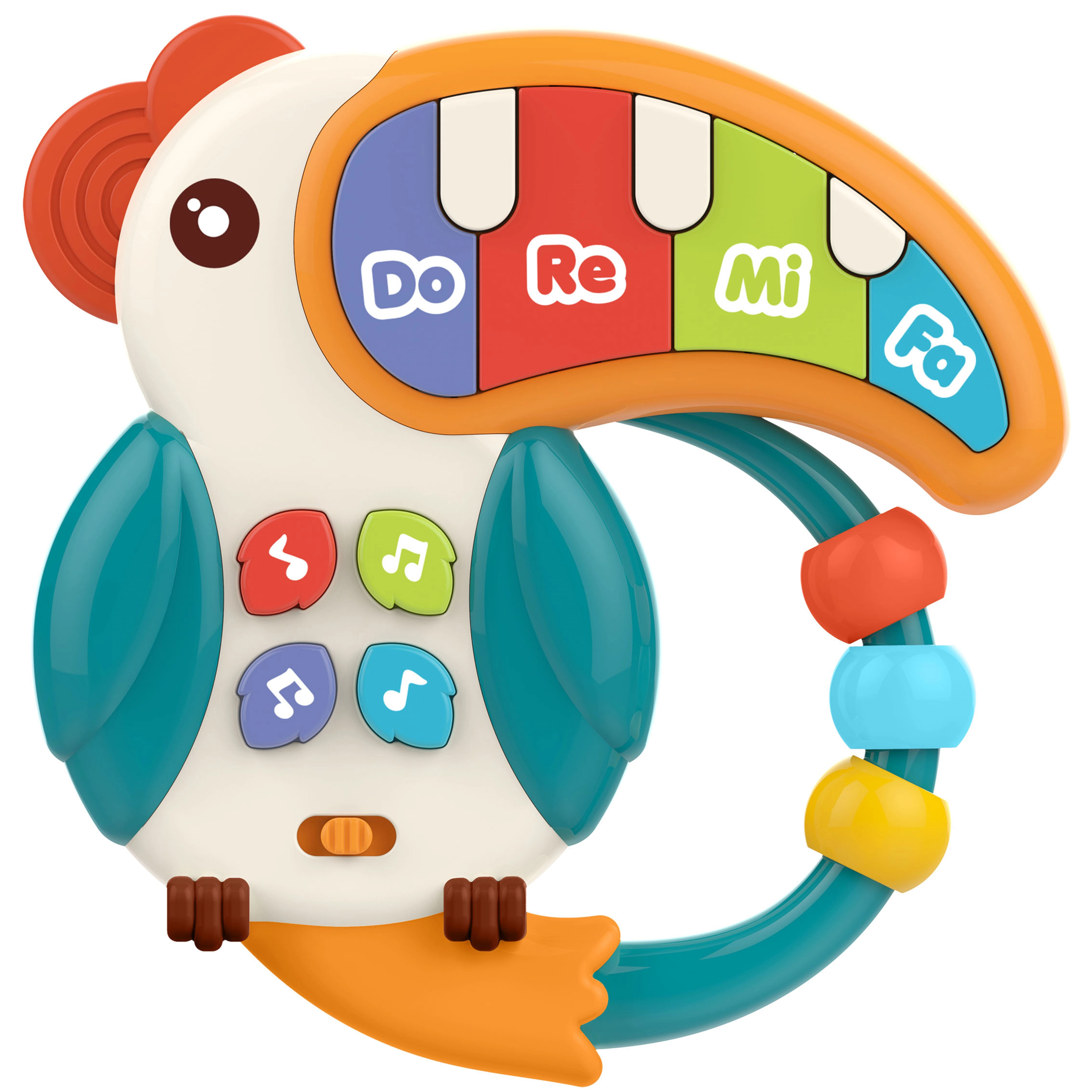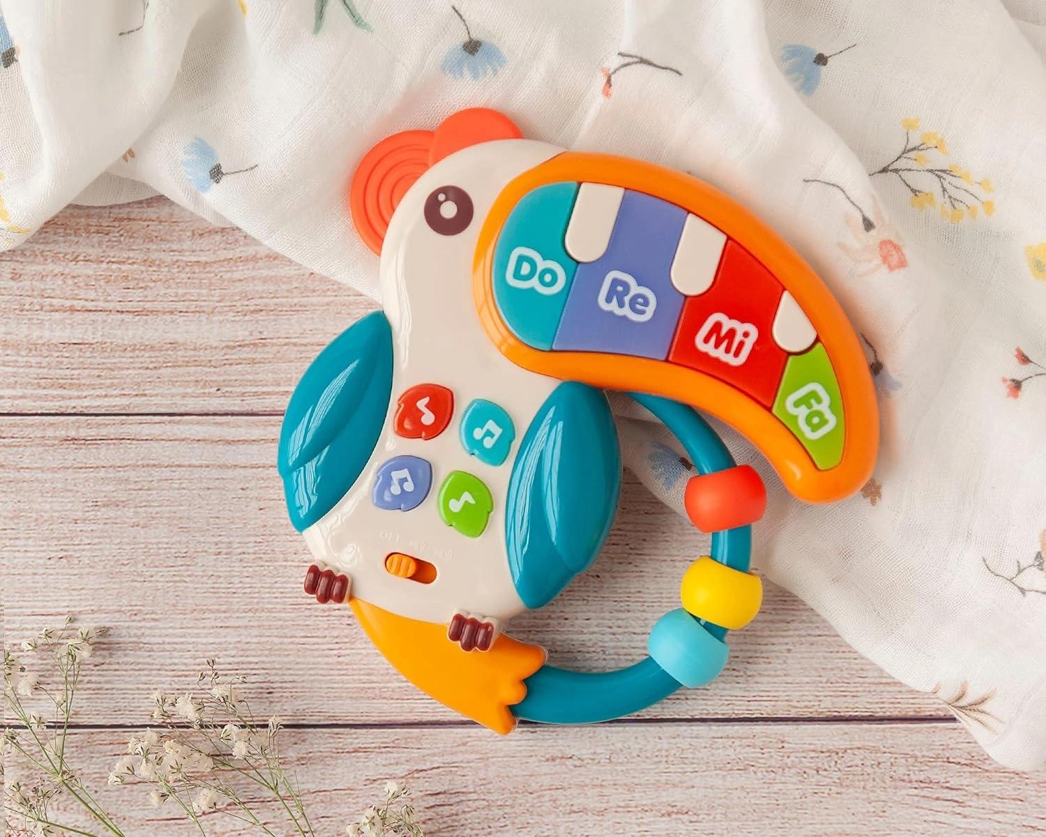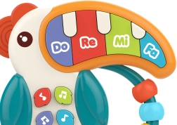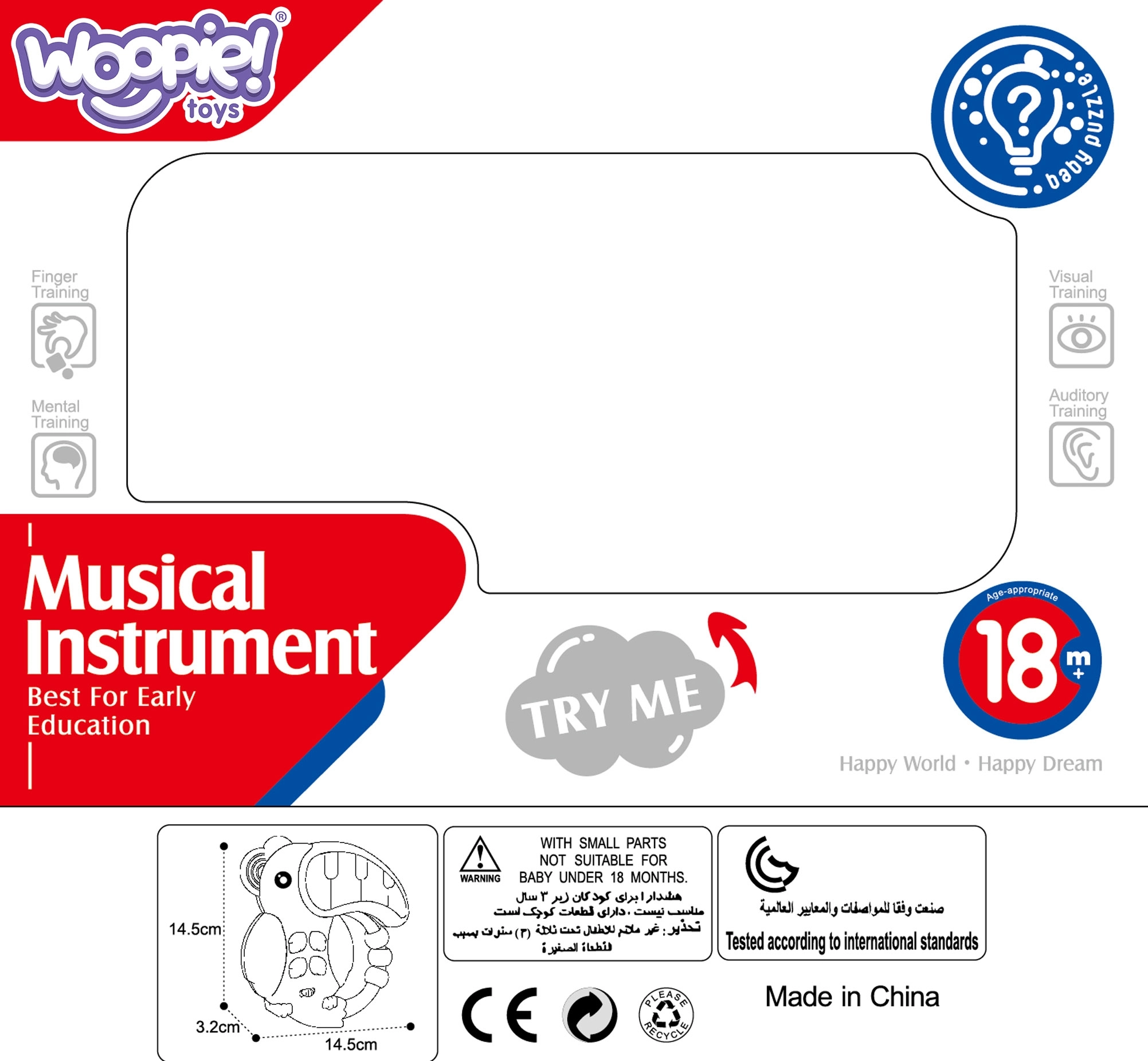 Woopie pelikanas – puikus pirmasis muzikinis žaislas patiems mažiausiems. Dėl spalvotų klavišų su garsais „Do, Re, Mi, Fa“ vaikai lengvai atranda muzikos pasaulį, o stumdydami karoliukus ir spausdami mygtukus lavina smulkiąją motoriką ir akių–rankų koordinaciją. Minkšta skiauterė ir lankelis su žiedeliais taip pat veikia kaip kramtukas, padedantis, kai dygsta dantukai.