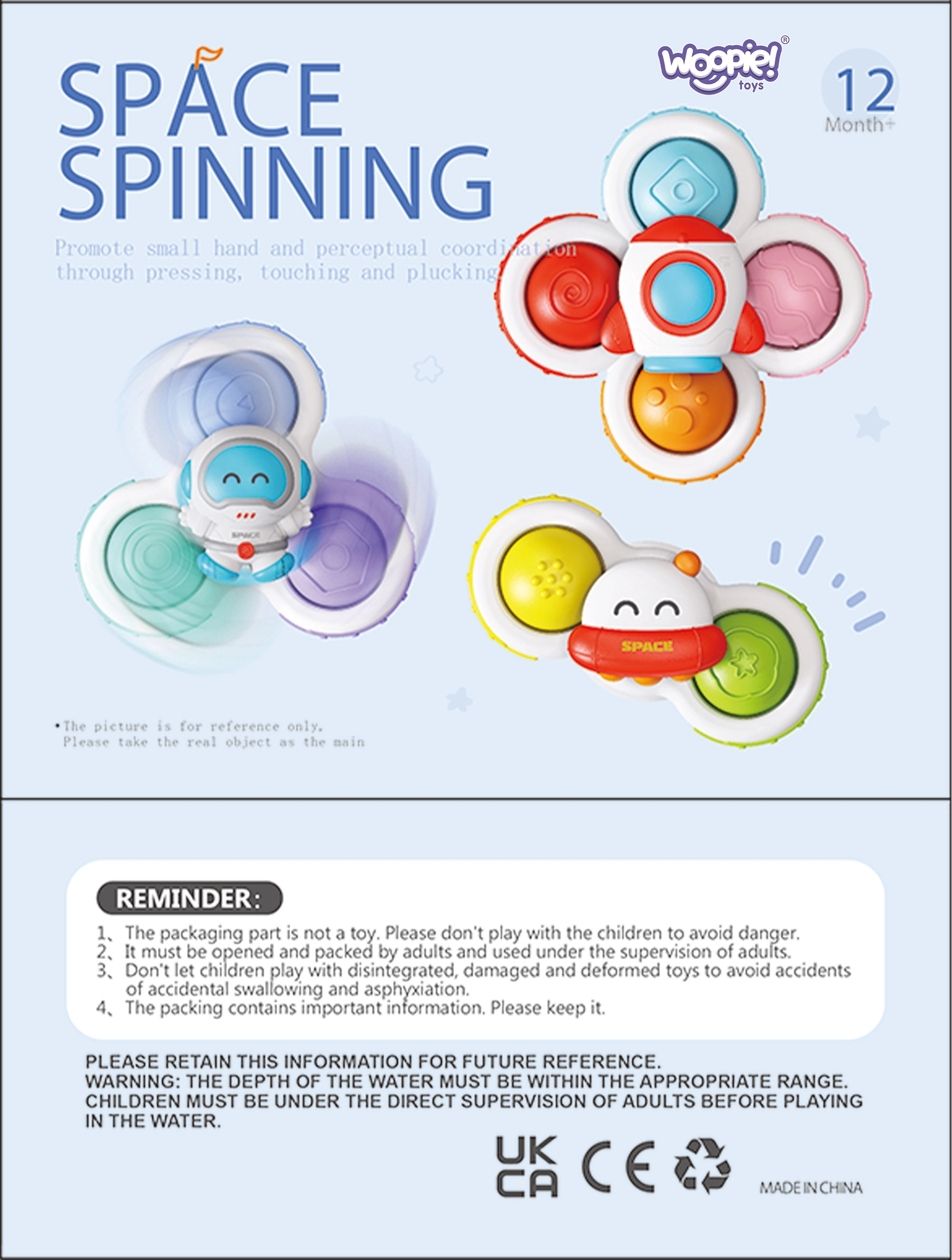 Woopie vaikų suktukų rinkinys pristato kosminę temą su raketos, ateivio ir NSO motyvais. Šie plastikiniai žaislai puikiai tinka žaisti įvairiose aplinkose. Suktukai turi gumuotus spaudžiamus elementus, kurie skatina jutimų lavinimą. Dėl siurbtukų žaislai lengvai tvirtinami prie skirtingų paviršių – tai idealu kelionėse ar maudantis vonioje. Elastingi guoliai užtikrina sklandų ir ilgalaikį sukimąsi be pastangų.