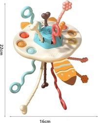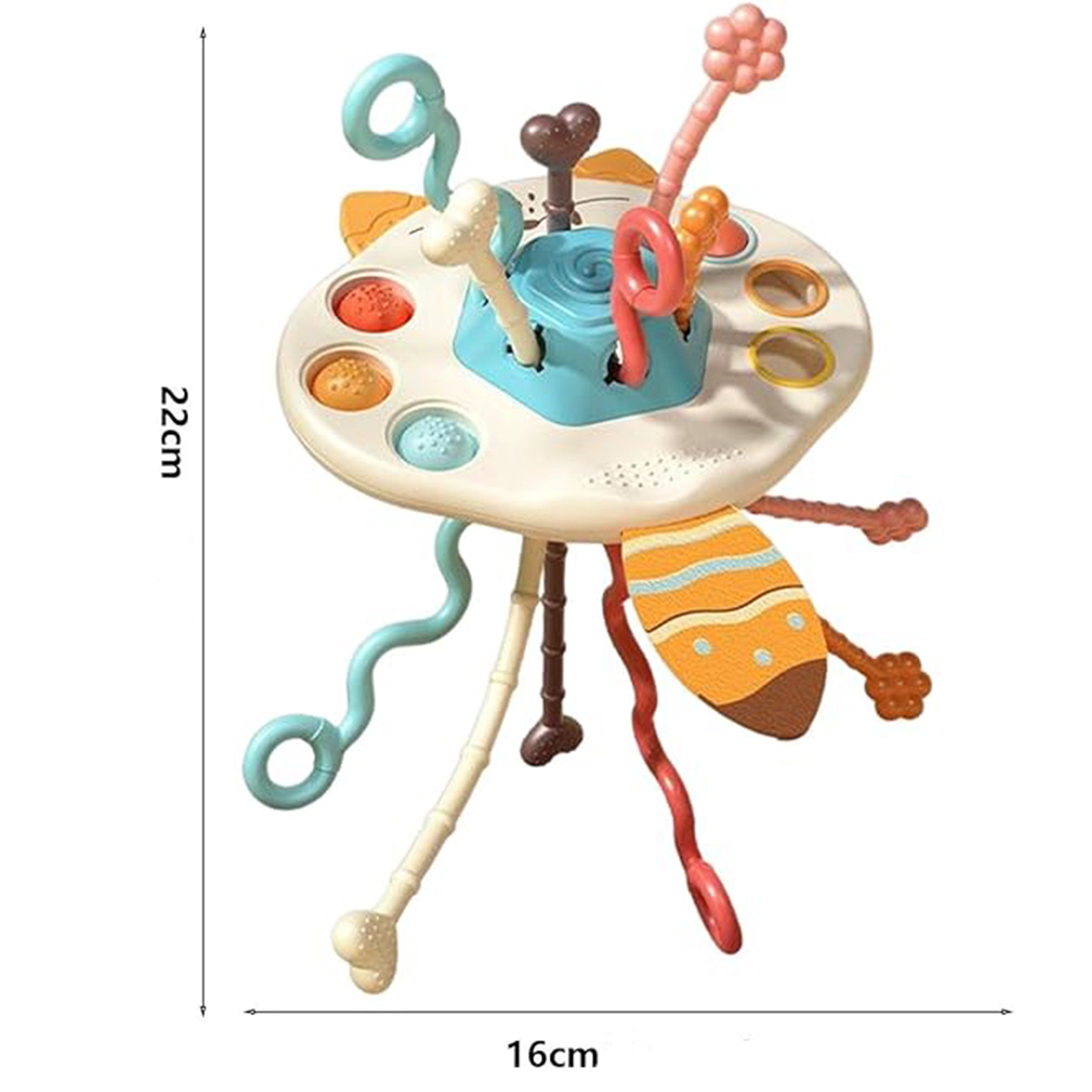Dėka trijų minkštų mygtukų ir vieno kietesnio slankiojančio mygtuko vaikai lavina koordinacinius įgūdžius, griebimą ir susikaupimą. Šešios traukiamos virvelės su skirtingomis struktūromis didina motyvaciją manipuliuoti ir skatina savarnkišką žaidimą, paremtą Montessori principais.