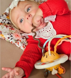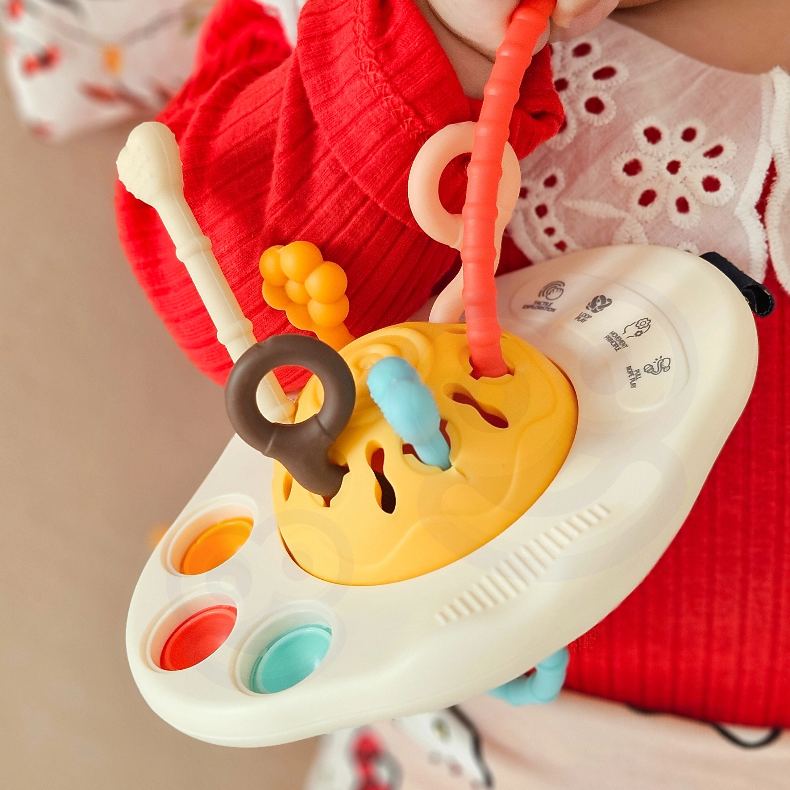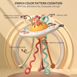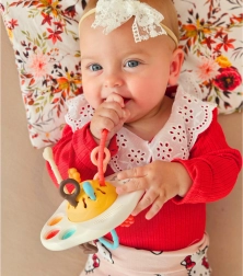 Atraskite daugiafunkcį sensorinį žaislą, kurio forma primena UFO, jungiantį kramtuką, barškutį ir interaktyvias „traukiojamas“ virveles. Skatina motorikos ir koordinacijos vystymąsi, stimuliuoja regą, klausą ir lytėjimą, o taip pat padeda mažinti diskomfortą dygstant dantukams. Saugios, be BPA medžiagos ir paprasta priežiūra daro jį idealiu pasirinkimu kūdikiams nuo 6 mėn.