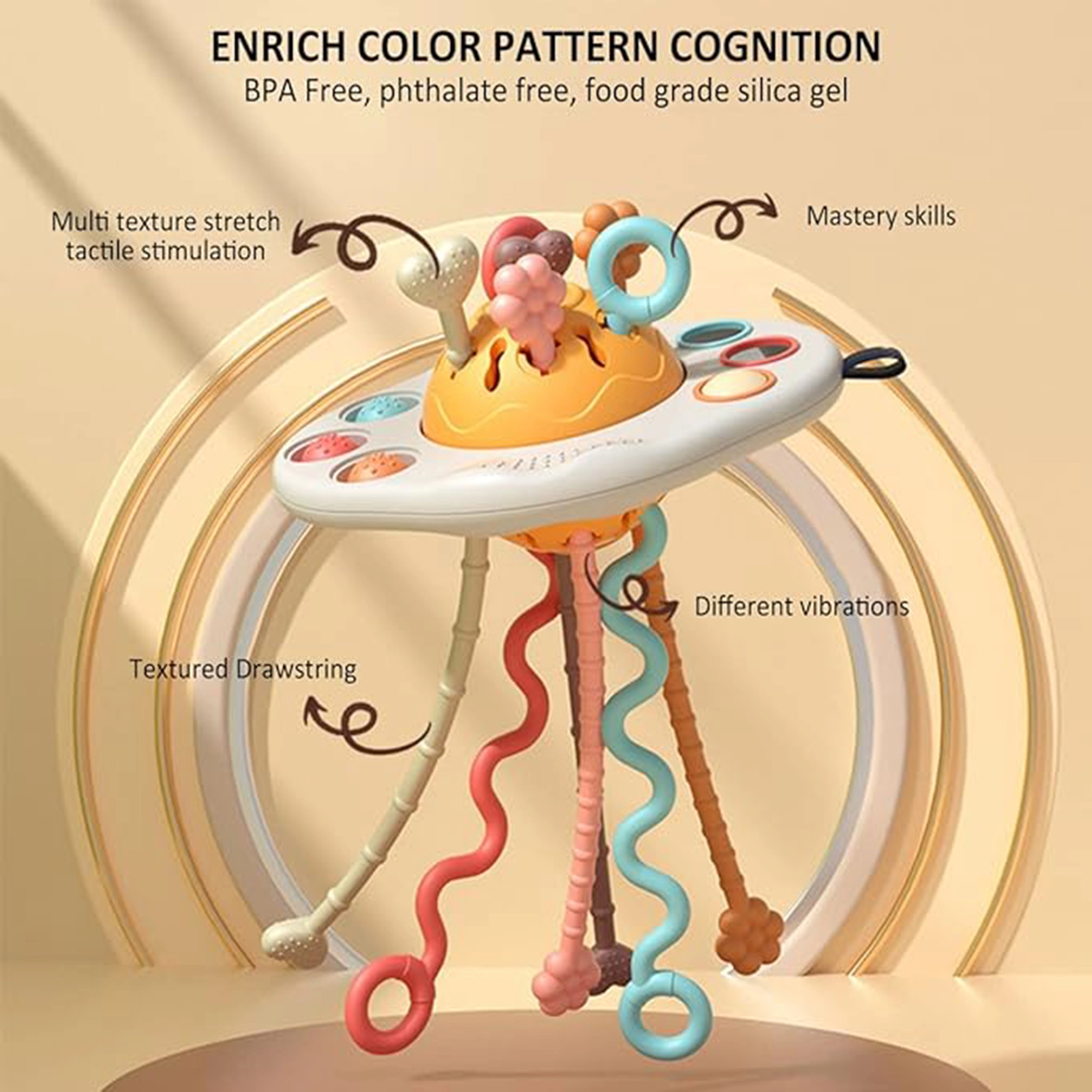 Šis vaikiškas montesorio žaislas WOOPIE BABY, kurio forma – UFO, suteikia gausius sensorinius dirgiklius dėl šešių virvelių su skirtingomis tekstūromis ir spalvomis, trijų minkštų mygtukų ir vieno tvirto stumdomo mygtuko. Traukiant virveles atsiranda įvairūs garsai ir lengvos vibracijos, kurios skatina smalsumą ir susitelkimą. Minkšti kraštai ir faktūriniai paviršiai suteikia palengvėjimą jautrioms dantenoms dantukų dygimo metu.