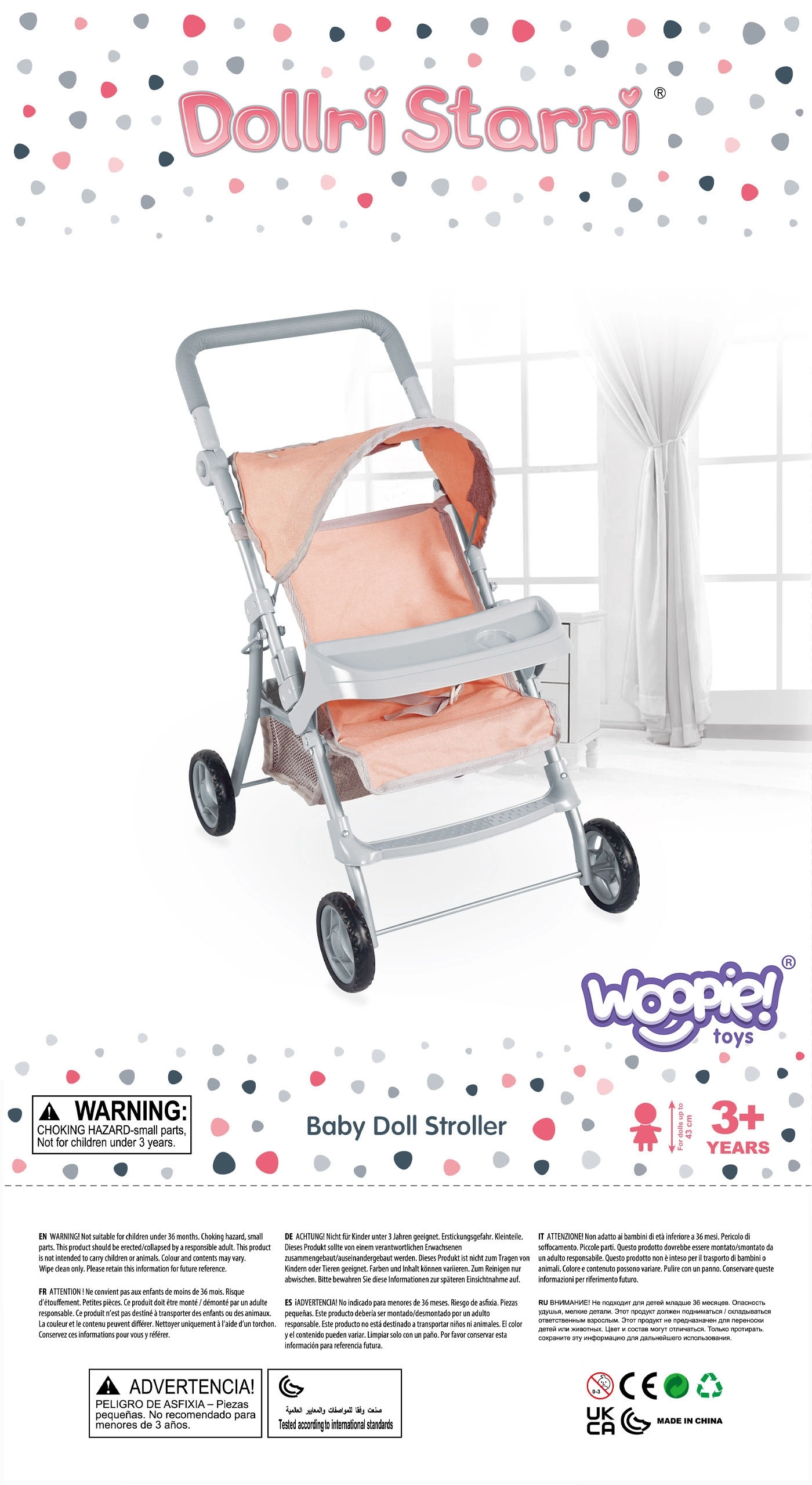 Komplekte yra pakojis ir apatinis krepšelis būtiniausiems daiktams. Uždangalus galima nuimti ir išskalbti, todėl vežimėlį lengva prižiūrėti švarų. Pasibaigus žaidimui jį paprastai sulankstysite ir padėsite – puikiai tinka mažesniems kambariams.