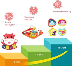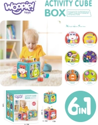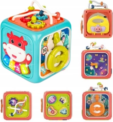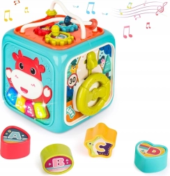 Be muzikinių funkcijų, kube yra rūšiuoklis su 4 formomis ir raidėmis, sukinėjami laikrodžiai, dantračiai, vairas su mašinėle ir rutuliukų labirintas. Tvirtas plastikas, apvalinti kraštai ir netoksiški dažai užtikrina saugų žaidimą nuo pirmųjų mėnesių. Maitinimas: 3× AA (nepridedama).