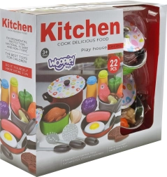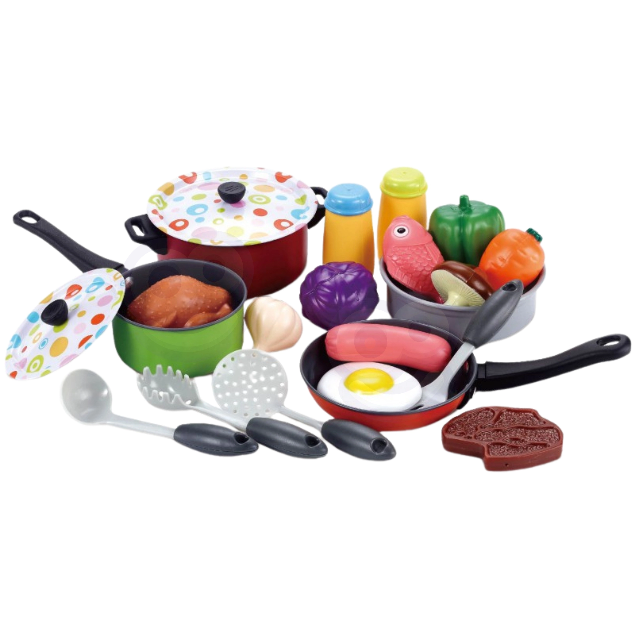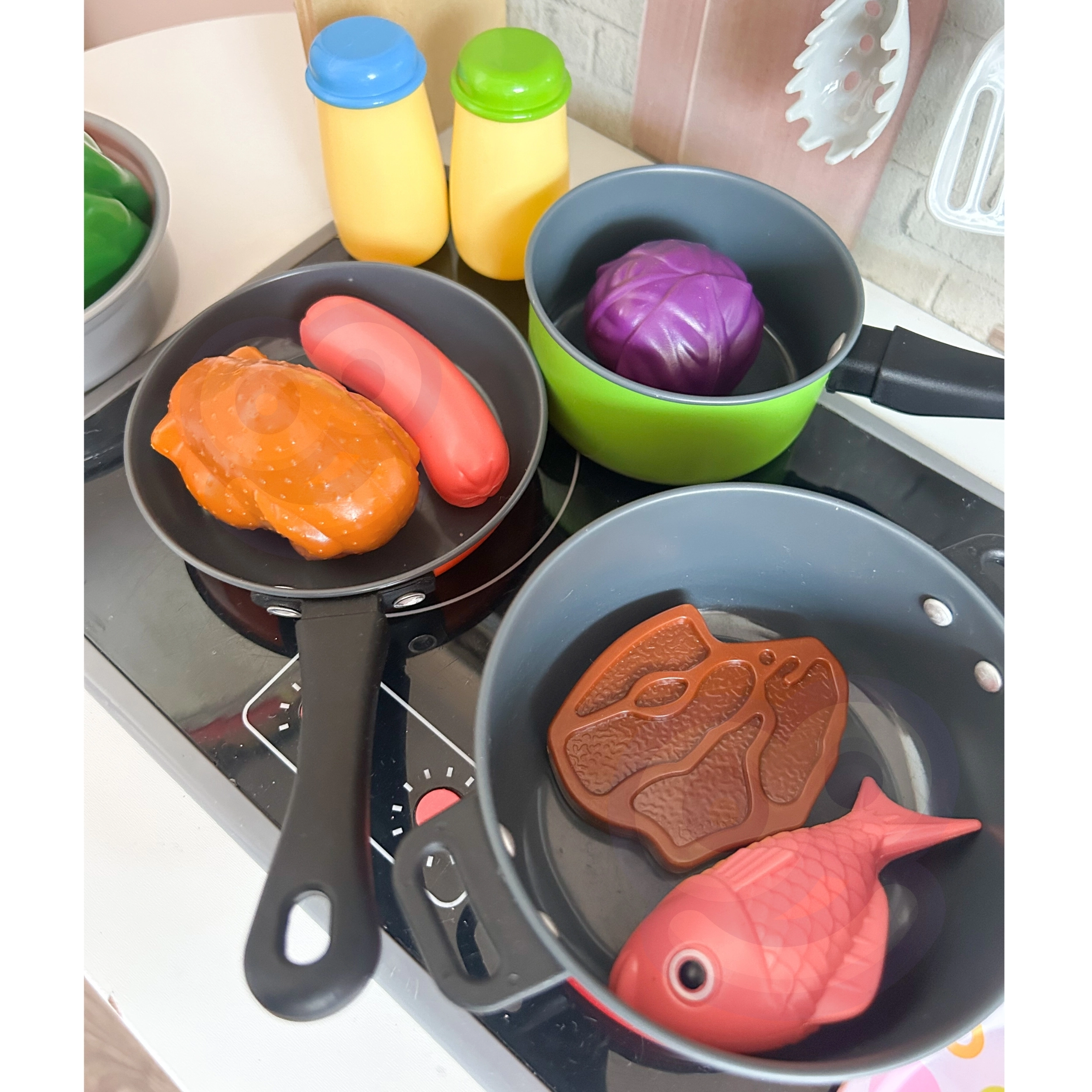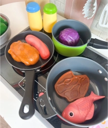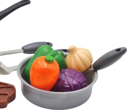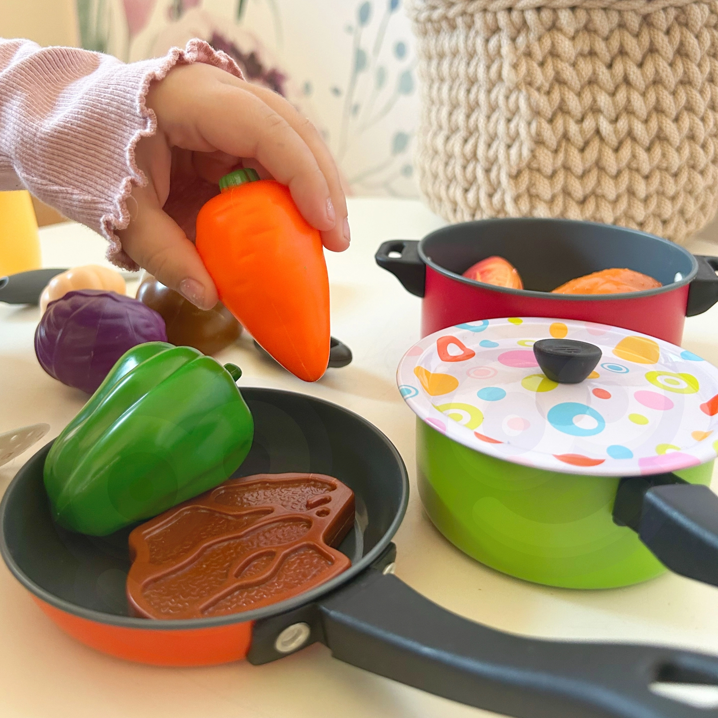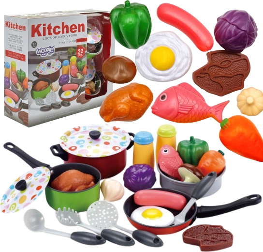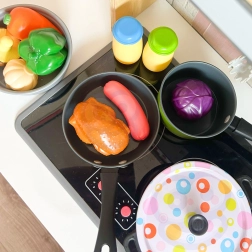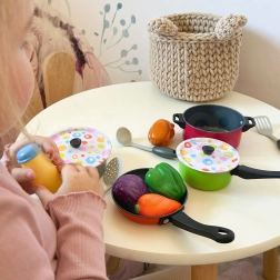 Puodai su dangteliais, keptuvė ir spalvingi ingredientai leidžia vaikams atkartoti tikrą gaminimą, lavinti vaizduotę ir smulkiąją motoriką.